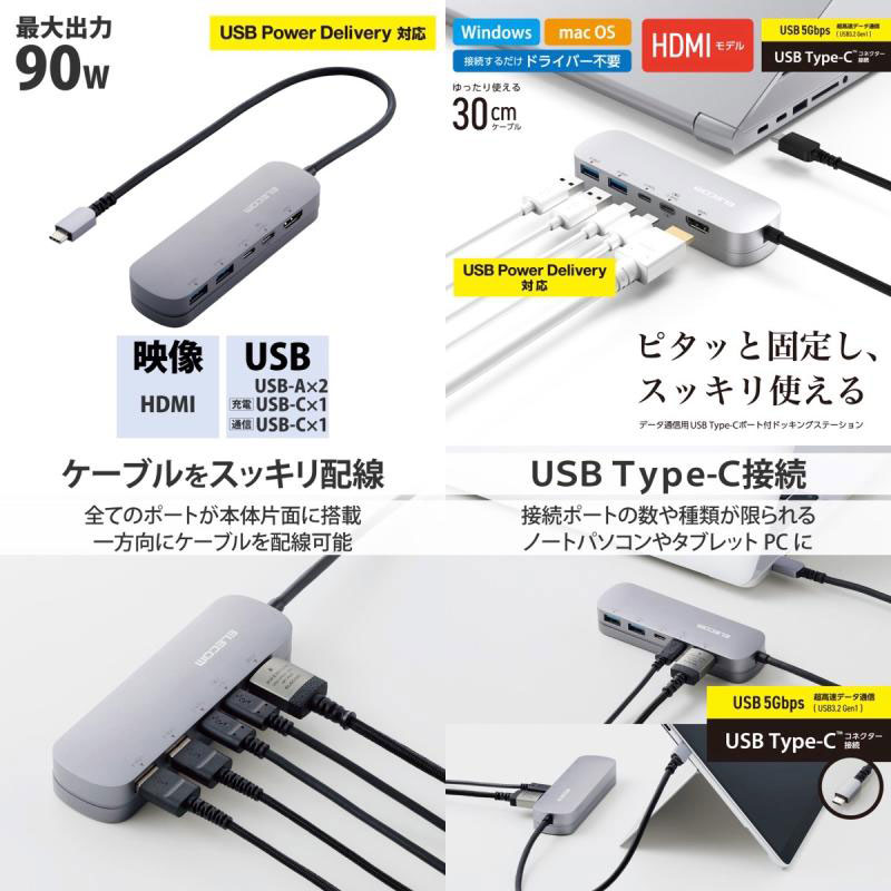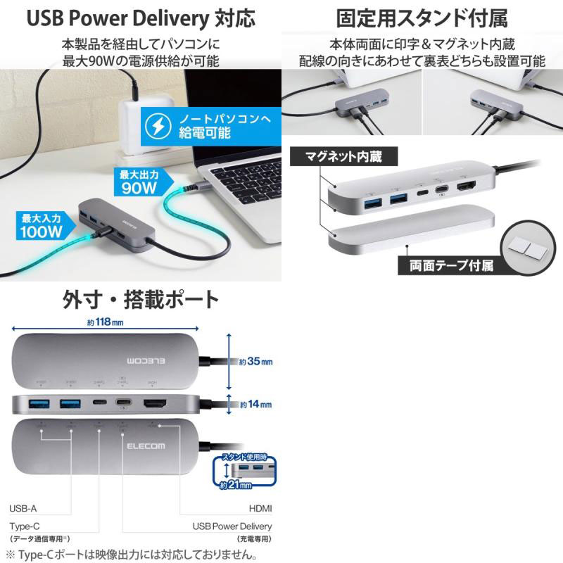 ●気になる商品USB 5Gbps(USB3.2(Gen1))に対応したUSB Type-C(TM)ポートを搭載したドッキングステーションです。全てのポートを本体1面に搭載し、両面テープでデスクに固定できるスタンド付きのため、ピタッと固定し、すっきり使用できます。■ USB Type-C(TM)コネクターでパソコンに接続し、USB機器やHDMIディスプレイを接続できるドッキングステーションです。■ パソコン本体との接続は、最大5Gbps(理論値)の超高速データ転送を実現するUSB 5Gbps(USB3.2(Gen1))に対応しています。■ USB 5Gbps(USB3.2(Gen1))に対応したUSB Type-C(TM)を1ポート搭載しています。※ データ通信専用、映像出力には対応していません。※ USB 5Gbpsでご使用になるには、お使いのパソコン・デバイスがUSB 5Gbpsに対応している必要があります。■ USB Power Deliveryに対応したUSB Type-C(TM)を1ポート搭載しています。■ USB Type-C(TM)コネクターを経由して最大100W(※)の電力をデバイス/パソコン本体に供給するUSB Power Deliveryに対応しています。■ USB Type-C(TM)電源アダプターを接続することで、本製品を経由し、パソコン本体を充電することができます。※ 製品本体にて10Wを消費しますので、実際の出力は最大90Wとなります。※ 90Wで給電が必要な場合は、100W出力の充電器をご用意ください。■ USB 5Gbps(USB3.2(Gen1))に対応したUSB Standard-Aポートを2ポート搭載しています。■ パソコンから外部モニターへ映像出力ができるHDMIポートを搭載しています。※ 本製品で映像出力を行う際は、機器がDisplayPort(TM) Alt modeに対応していることを確認してください。■ USB Type-C(TM)コネクターは、表と裏がなく、向きを気にせず差し込み可能です。※ USB Type-C(TM)コネクターを標準搭載するパソコンでのみ使用可能です。■ 放熱性と耐ノイズ性に優れ、高級感のあるアルミ筺体を使用しています。■ 持ち運びしやすいスリムタイプです。■ ケーブルは紛失の心配がない直付けタイプです。タブレットPC/2in1パソコンでもゆったり接続できるケーブル長約30cmです。■ 全てのポートを本体1面に搭載しているので、接続したケーブルを配線しやすく、デスクが煩雑になりません。■ 両面テープでデスクに固定できるスタンド付きです。製品本体はマグネットでスタンドに設置できるので、着脱も簡単です。■ 本体はシンメトリーデザインになっていますので、表裏どちらでもスタンドに設置可能です。※ USB Type-C(TM)コネクターからの充電に対応しない本体の場合、本製品のUSB Type-C経由での本体充電はできません。充電を行う際は、機器がUSB Power Deliveryに対応していることを確認してください。※ 本製品はOS起動前のシステム画面やBIOS画面では動作しません。※ 本製品はパソコン本体のUSB Type-C(TM)端子に直接接続してください。USBハブや増設ボードのUSB Type-C(TM)端子に接続した場合、本製品をご利用いただけません。※ USB Type-C and USB-C are trademarks of USB Implementers Forum■ 自社環境認定基準を1つ以上満たし、『THINK ECOLOGY』マークを表示した製品です。■ 廃棄物削減に取り組み、製品に同梱する取扱説明書等をペーパーレス化した製品です。■ 環境保全に取り組み、製品の包装容器におけるプラスチック重量を、社内基準製品より20%以上削減した製品です。■ 環境保全に取り組み、製品の包装容器が紙・ダンボール・ポリ袋のみで構成されている製品です。[仕様情報]対応OS(Windows) : Windows 11/Windows 10対応OS(mac) : macOS Ventura 13/macOS Monterey 12対応OS(iPadOS) : iPadOS 16対応OS 備考 : ※各OSの最新バージョンへのアップデートや、サービスパックのインストールが必要になる場合があります。コネクタ仕様(アップストリーム) : USB Type-C(TM)<USB 5Gbps(USB3.2(Gen1))>、USB Power Delivery対応(最大入力100W / 最大出力90W)、DisplayPort(TM) Alt mode (USB2.0接続時は、USB2.0互換で動作(USB2.0時は、映像出力非対応)) USBポート(ダウンストリーム) : 1:USB Type-C(TM)<USB 5Gbps(USB3.2(Gen1))>x1 ※データ通信専用、映像出力には対応していません。USBポート(ダウンストリーム) : 2:USB Type-C(TM)x1<最大出力90W> ※充電専用USB Power DeliveryポートUSBポート(ダウンストリーム) : 3:USB Standard-A<USB 5Gbps(USB3.2(Gen1))、供給電力値:2ポート合計 4.5W(5V/0.9A)>x2映像出力ポート(ダウンストリーム) : HDMIx1<対応解像度:最大4K/30Hz>電源方式 : バスパワー ケーブル長 : 約30cm※コネクター含まず外形寸法 : 1:製品本体(固定用スタンド含まず):幅約118mmx奥行約35mmx高さ約14mm ※ ケーブル含まず外形寸法 : 2:製品本体+固定用スタンド:幅約118mmx奥行約35mmx高さ約21mm ※ ケーブル、突起部分含まず動作環境 : 温度5~40℃、湿度30~80% ※結露なきこと付属品 : 固定用スタンド、固定用両面テープx2個[保証期間]1年間[メーカー]エレコム ELECOM (エレコム)型番JANDST-C19SV/EC4549550258043[対応] mac / win 両対応[性能] PD対応[性能] スタンド機能[性能] バスパワー[材質] アルミニウム[端子] HDMI[端子] USB A[色] シルバー[規格] 4K[規格] USB Power Delivery (USB PD)[規格] USB Type-C[規格] USB3.0[長さ] 0.3mエレコム Type-C ドッキングステーション アルミボディ USB-Ax2 HDMIx1 USB-Cx2 PD対応 シル