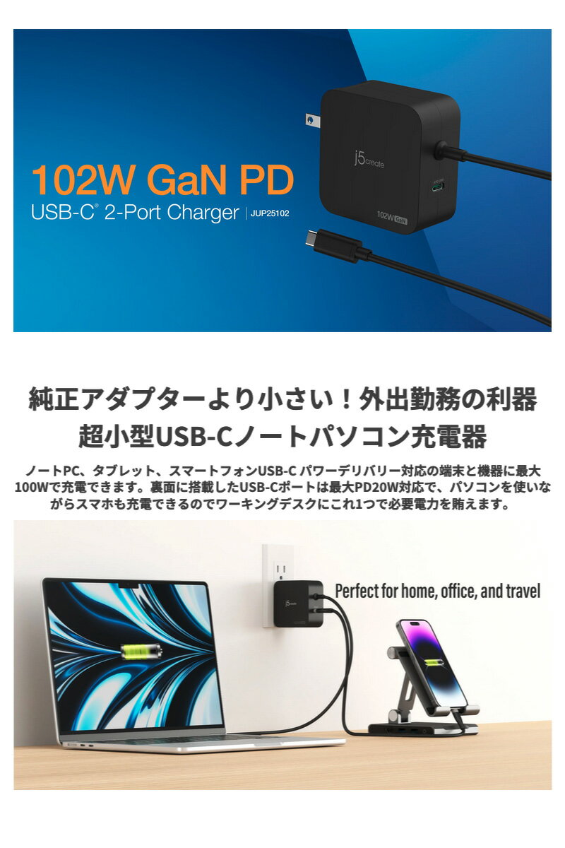●気になる商品JUP25102 102W GaN 2ポート USB PD急速充電器この製品は、GaN窒化ガリウムを搭載したUSB-C電源アダプターであり、本体にUSB-Cケーブルが付いており、別途で充電ケーブルを購入する必要がありません。GaN窒化ガリウム素材を搭載しているため、純正のPC付属電源アダプターより約1/3のサイズに縮めました。持ち運びに便利で、電源タップのスペースも取りません。PD100WのUSB-Cケーブルをサポートするだけでなく、背面にはUSB-C 20W充電ポートも搭載されており、ノートパソコンを充電しながら、スマートフォンやタブレットも同時に充電することができます。PSE日本認証取得済み。■ 製品概要ノートPC、タブレット、スマートフォンUSB-C パワーデリバリー対応の端末と機器に最大100Wで充電できます。裏面に搭載したUSB-Cポートは最大PD20W対応で、同時にスマホとタブレットを充電することができます。2ポート同時利用時 : USB-C1.82W+USB-C2.20W。パソコンを使いながらスマホも充電できるのでワーキングデスクにこれ1つで必要電力を賄えます。■ USB-Cケーブル一体化本機は通常のUSB充電器と違ってUSB-Cケーブルが本体についているので、別売りのUSB-Cケーブルを用意することなく、購入してからすぐにご使用いただけます。■ 窒化ガリウム採用複数ポートのUSB充電器によく使われている窒化ガリウム(GaN)の採用でよりコンパクトなサイズに。発熱をコントロールしエネルギー効率を高めることを実現しています。■ PSE適合・マルチ保護システム日本電気用品安全法PSE技術基準適合しており、サージ保護、過電流保護、過熱保護、過電圧保護、過充電保護など保護システムを搭載しているので安心してご使用いただけます。■ ビジネス利器テレワークで自宅と会社の行き来で頻繫にPCを持ち出す際も、PCメーカー付属のアダプターより大幅に小型で鞄にも楽々収納できるので便利です。[仕様情報]スペック拡張ポートUSB-Cケーブル(オス)x1USB-C(メス)x1出力情報入力 : AC 100V-240V、50~60Hz,1.5A (max)各ポート出力USB-Cケーブル : 5V⎓3A, 9V⎓3A, 12V⎓3A, 15V⎓3A, 20V⎓5A (最大100W)USB-Cポート(裏) : 5V⎓3A, 9V⎓2.22A, 12V⎓1.67A (最大20W)同時利用時に : PD82W+PD20W合計出力 : 102W外観情報材質 : プラスチック外形寸法 : 68.5(W)x68(H)x33.3(D)mm重量 : 約1.8mパッケージ内容製品本体保証書[メーカー]ジェイファイブクリエイト j5 create型番JANJUP251024712795088212[性能] PD対応[性能] モバイル[性能] 急速充電[材質] プラスチック[色] ブラック[規格] USB Power Delivery (USB PD)[規格] USB Type-Cj5 create USB Type-C 102W ケーブル一体型 GaN PD3.0 急速充電器 20W USB Type-C 1ポート付き ブラック # JUP25102 ジェイファイブクリエイト