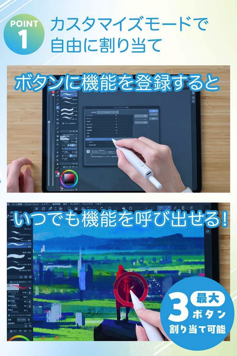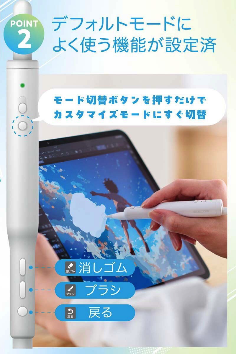●気になる商品片手でサクッとショートカット!お絵かきの作業時間を短縮し、描く楽しさをもっと自由にする“draw´(ドローダッシュ)”シリーズのショートカットグリップです。Apple Pencilをスライドさせて簡単に装着でき、3つのショートカットキーを使うことで、頻繁に使用するツールやメニューを片手で素早く操作可能。デフォルトモードとカスタマイズモードもボタン1つで切り替えられ、作業効率が大幅に向上します。■ Apple Pencilをスライドさせて簡単に装着できるグリップ型のショートカットデバイスです。 ※ 本製品でペンの根元まで完全に覆うと、Apple Pencilの一部機能が使用できなくなる場合があります。■ 3つのショートカットキーを使うことで、頻繁に使用するツールやメニューを片手で素早く操作でき、作業効率が向上します。■ ボタン1つでデフォルトモードとカスタマイズモードを切り替えられます。■ デフォルトモードでは「戻る」「ブラシ」「消しゴム」が設定されています。■ カスタマイズモードでは、3つのボタンに好きなショートカットを登録できます。※ ショートカットキーの割り当てが可能なソフトのみ対応※ CLIP STUDIO PAINTの動作確認済みです。■ グリップ部分が細く設計されているため、長時間作業しても疲れにくく、快適に使用できます。■ 本製品を装着したままApple Pencilの充電が可能で、充電時に取り外す手間がありません。■ 10分放置すると自動でスリープモードに移行し、電池の消耗を抑えます。■ 充電用ポートは、USB Type-C(TM)です。USB-A - USB Type-Cケーブルが付属しています。※ 本製品にACアダプター(AC充電器等)は付属していないため、出力5V/500mA以上のUSB出力アダプターを別途ご用意ください。※ USB Type-C and USB-C are trademarks of USB Implementers Forum■ 自社環境認定基準を1つ以上満たし、『THINK ECOLOGY』マークを表示した製品です。■ 環境への負荷軽減のため、輸送効率を高める設計の外装箱を使用した製品です。[仕様情報]対応機種 : 本体装着:Apple Pencil Pro・Apple Pencil (USB-C)・Apple Pencil (第2世代)・Apple Pencil (第1世代)、Bluetooth接続:Bluetooth(R)HOGPに対応したiPadOS搭載機接続方式 : USB2.4GHz無線/Bluetooth(R)無線Bluetooth規格 : Bluetooth 5.0 Class2対応プロファイル : HOGP(HID Over GATT Profile)対応OS(iPadOS) : iPadOS 18.5通信方式 : GFSK方式電波周波数 : 2.4GHz帯ボタン数 : 5個 ※電源スイッチ含む外形寸法 : 幅約15mmx奥行約110mmx高さ約18mm(最大凸部) 材質 : 本体:ABS+ポリカーボネート、 電源スイッチ:ABS+ポリカーボネート 操作ボタン:シリコン質量 : 約15g 電池 : リチウムイオン電池使用時間 : 約100時間 ※ご使用状態によっては、目安の時間よりも早く充電が必要になる場合があります。充電時間 : 約70分 ※使用状況や環境により変化します。付属品 : USB-A - USB Type-C(TM)ケーブル[保証期間]1年間[メーカー]エレコム ELECOM (エレコム)型番JANP-SCAPG01WHN4549550400442[対応] Apple Pencil[対応] Apple Pencil (USB-C)[対応] Apple Pencil (第2世代)[対応] Apple Pencil Pro[材質] シリコン[材質] ポリカーボネート[規格] 2.4GHz 無線[規格] USB Type-Cエレコム アップルペンシルショートカットグリップ モード切替 ショートカット機能付き Type-C給電 ホワイト # P-SCAPG01WHN エレコム