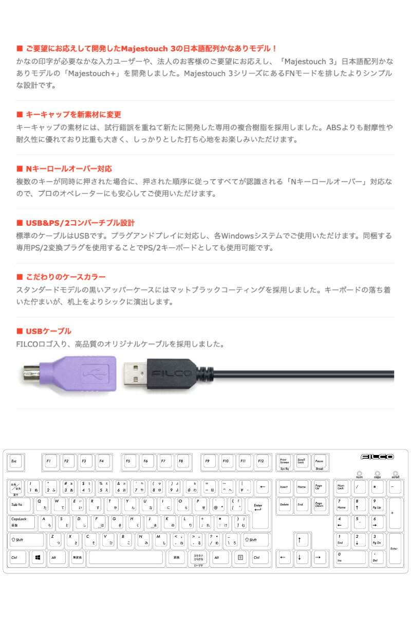 Majestouch + 茶軸・フルサイズ・日本語かなあり・マットブラック■ ご要望にお応えして開発したMajestouch 3の日本語配列かなありモデル!かなの印字が必要なかな入力ユーザーや、法人のお客様のご要望にお応えし、「Majestouch 3」日本語配列かなありモデルの「Majestouch+」を開発しました。Majestouch 3シリーズにあるFNモードを排したよりシンプルな設計です。■ キーキャップを新素材に変更キーキャップの素材には、試行錯誤を重ねて新たに開発した専用の複合樹脂を採用しました。ABSよりも耐摩性や耐久性に優れており比重も大きく、しっかりとした打ち心地をお楽しみいただけます。■ Nキーロールオーバー対応複数のキーが同時に押された場合に、押された順序に従ってすべてが認識される「Nキーロールオーバー」対応なので、プロのオペレーターにも安心してご使用いただけます。■ USB&PS/2コンバーチブル設計標準のケーブルはUSBです。プラグアンドプレイに対応し、各Windowsシステムでご使用いただけます。同梱する専用PS/2変換プラグを使用することでPS/2キーボードとしても使用可能です。■ こだわりのケースカラースタンダードモデルの黒いアッパーケースにはマットブラックコーティングを採用しました。キーボードの落ち着いた佇まいが、机上をよりシックに演出します。■ USBケーブルFILCOロゴ入り、高品質のオリジナルケーブルを採用しました。[仕様情報]対応機種USBポートもしくはPS/2ポートを持ち、Windows XP SP2以降/Vista/7/8/8.1/10/11 が動作するパソコンキースイッチ/キー数 : Cherry MX 茶軸 (tactile feel)/108キーかな印刷 : ありキーピッチ/キーストローク : 19mm/4mmサイズ/重量 : 幅440x奥行138x高さ38.5mm(スタンド使用時49.5mm)/1.2kgインターフェース : PS/2/USB (PS/2は変換コネクタを使用)ケーブル長 : 1.5m(直付)[保証期間]1年間[メーカー]フィルコ FILCO型番JANFKBN108M/JMBH4515213041512[対応] Windows[性能] 有線[性能] 茶軸[性能] 非光沢[性能] 高耐久[端子] USB A[色] ブラック[色] マットブラック[規格] CHERRY MX[規格] JIS配列[シリーズ]s_5245095363FILCO Majestouch+(プラス) フルサイズ CHERRY MX茶軸 108キー 日本語配列 かなあり 有線 マットブラック # FKBN108M/JMBH フィルコ