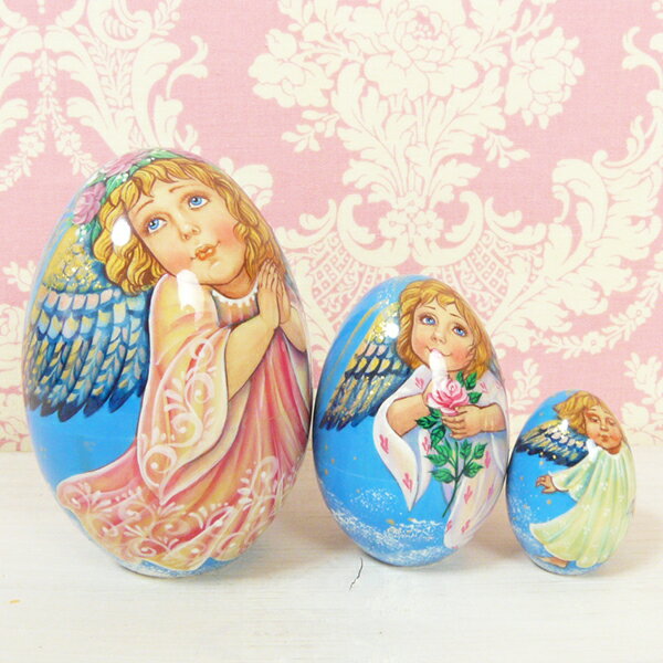 優しく穏やかで清楚なエンジェルの エッグフォルムマトリョーシカです! 透けるように清らかな透明感のあるエンジェル達♪ その表情は優しく穏やかでとても愛らしいです。 優しいベールにつつまれたような存在感は マトリョーシカという概念を覆させる 美しいマトリョーシカです! バックカラーとお揃いの台座付きです 台座に乗せインペリアル・イースターエッグのように 楽しんだりもできます♪ ++++++++++++++++++++ サイズ マトリョーシカ:高さ約9cm 台座:高さ約6cm 木製 3人組み ++++++++++++++++++++ ※お使いのモニターの発色具合によって 実際のものと色が異なる場合がございます