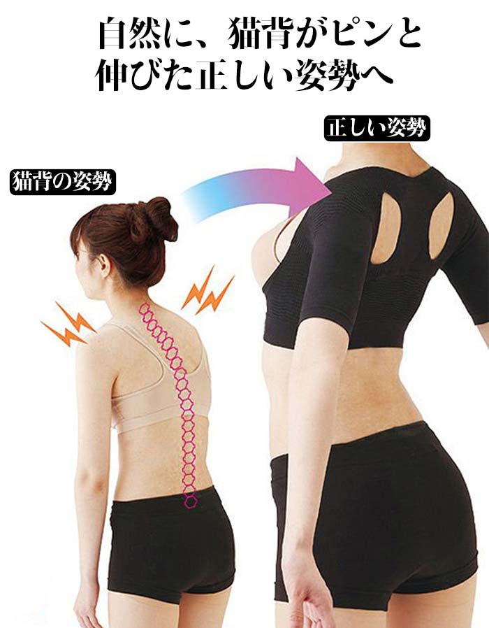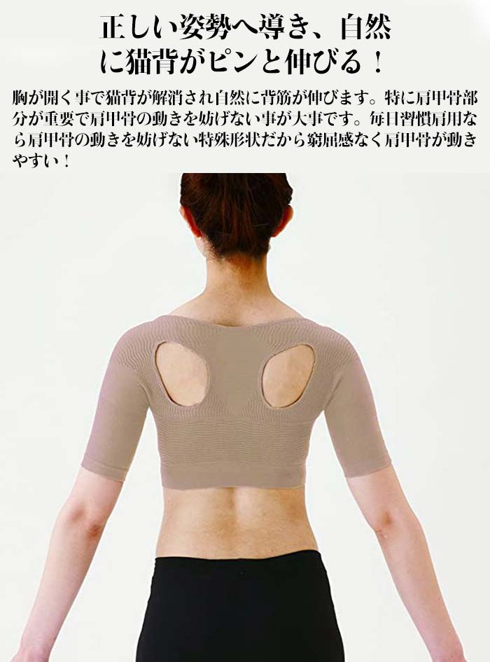 材質 : ナイロン90%、ポリウレタン10% サイズ:M / L カラー:肌色/ブラック セット内容:同色2点セット 商品説明 ●たすき掛け効果で肩甲骨を引き寄せ、自然に猫背がピンと伸びた正しい姿勢へ導きます。 ●猫背の改善により肩甲骨奥の僧帽筋の緊張がほぐれて肩が楽になります。 ●肩甲骨の動きを妨げない特殊形状だから窮屈感なく固まった肩甲骨が動きやすい。 ●腕の重さは両腕で約6~10kg、肩関節を外向きに開くスパイラル着圧が肩への負担を軽減します。 ●バストを下から支えて肩への負担を軽減、さらに無理なく自然とバストアップ効果まで。 ●薄くて伸縮性に優れているから苦しくなく、アウターに響かず着用できる。 ●吸湿速乾素材だから一年中さらっと快適。 ※素材の注意書き:お使いのモニターの発色具合によって、実際のものと色が異なる場合がございます。 ※サイズには多少の誤差が出る場合が御座います。ご了承下さい。