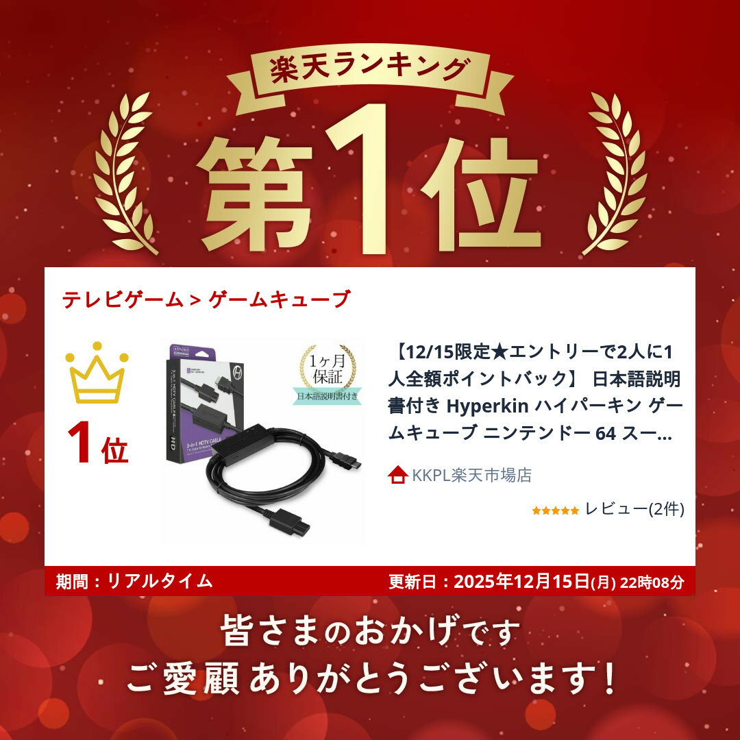 日本語説明書付き,1ヶ月保証!! Hyperkin ハイパーキン ゲームキューブ ニンテンドー 64 スーパーファミコン専用 アダプタケーブル HD Cable for GC/N64/SFC HDMI コンバーター 輸入品 送料無料 この商品について 【GC・64・SFC対応】Hyperkin HDケーブル アダプタケーブル HDMI コンバーター 輸入品ゲーム機の映像をより鮮明に!Hyperkinのアダプタケーブルで、ゲームキューブ、ニンテンドー64、スーパーファミコンをHDMI対応のテレビに接続し、鮮やかな映像を楽しめます。レトロゲーム機の映像を現代のテレビでお手軽に楽しむための必須アイテムです。・ゲームキューブ、ニンテンドー64、スーパーファミコンに対応・鮮明な映像でレトロゲームを楽しめる・HDMI端子対応で、最新のテレビでも使用可能・コンパクトなデザインで収納も便利ご注意点として、ゲームキューブ使用時には給電が必要となるため、ケーブルが少しかさばることがあります。また、まれに接続不良が発生する場合もありますが、電源を入れ直すことで改善することが多いです。レトロゲームファン必見のアイテムで、かつての名作を鮮やかな画質で再現。ゲーム機を現代のテレビに接続して、もっと快適にプレイしましょう! 12時までのご注文確定で当日発送 (土日祝は9時)1