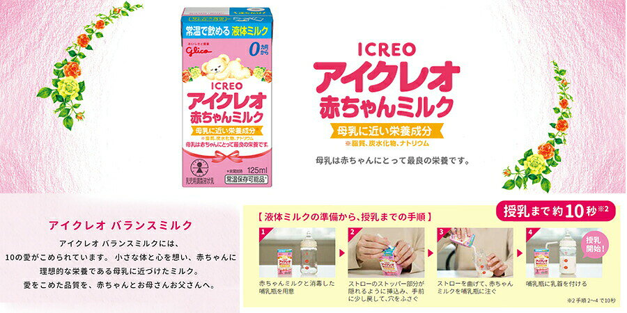 ■製品特徴 ◆小さな体と心を想い、赤ちゃんに理想的な栄養である母乳に近づけた乳児用液体ミルク。 愛をこめた品質を、赤ちゃんとお母さんお父さんへ。「無菌パック製法」で無菌化された状態でつめるので、常温で賞味期限(製造から)6か月という長期保存が可能です。いざという時の備えにも安心です。 ■賞味期限:製造から6ヶ月 ■使用方法 (1)開封前によく振る。 (2)専用ストローのストッパー部がはまるまでさす。 (3)消毒した哺乳瓶に移し替える。 (4)水などで希釈せず、そのまま飲ませる。 ●飲み残しは捨てる。 ●開封後はすぐに飲む。 ●飲む量は個人差があるので、必要に応じて加減する。 ■原材料 調整食用油脂(分別ラード、オレオ油、大豆油、ヤシ油、パームオレイン)、ホエイパウダー、乳糖、脱脂粉乳、たんぱく質濃縮ホエイパウダー、ガラクトオリゴ糖液糖、エゴマ油/V.C、レシチン、炭酸K、塩化K、水酸化Ca、V.E、イノシトール、タウリン、5’−CMP、硫酸亜鉛、ウリジル酸Na、硫酸鉄、ナイアシン、5’−AMP、パントテン酸Ca、硫酸銅、V.A、イノシン酸Na、グアニル酸Na、V.B1、V.B2、V.B6、カロテン、葉酸、ビオチン、V.D、V.B12、(一部に乳成分・大豆を含む) ■栄養成分 100gあたり エネルギー68kcal たんぱく質1.4g 脂質3.8g 炭水化物7.1g 食塩相当量0.04g ビタミンA70μg ビタミンB10.1mg ビタミンB20.14mg ビタミンB60.05mg ビタミンB120.1〜0.4μg ビタミンC39mg ビタミンD1.3μg ビタミンE2.6mg ビタミンK4μg ナイアシン0.8mg 葉酸26μg パントテン酸0.63mg ビオチン3μg カルシウム41mg リン32mg 鉄0.4mg カリウム92mg マグネシウム5mg 銅0.04mg 亜鉛0.4mg セレン1.6μg β−カロテン25μg イノシトール6mg リノール酸0.5g α-リノレン酸0.09g 塩素39mg コリン10mg リン脂質34mg タウリン3.1mg ガラクトオリゴ糖0.05g 灰分0.3g ■ご注意 ●赤ちゃんの体質や健康状態を考慮して使用すること。 ●使用にあたっては、医師や管理栄養士等にご相談ください。 ●無菌充填なので、常温で上部記載の賞味期限まで、使用可能。 ●温める際は別容器に移し、必ず人肌に冷まして使用すること。 ●容器に破損・膨張等や、色・におい・味に異常がある場合は使用しないこと。 ●紙パックに入ったまま、電子レンジで加熱しないこと。 ●冷たさが気になる場合は、室温(20℃前後)に戻すこと。 【お問い合わせ先】 こちらの商品につきましては当店(ドラッグピュア)または、下記へお願いします。 江崎グリコ株式会社 育児用ミルク・幼児食 電話:0120-964-369 受付時間:月〜金 9:00〜18:30 土日・祝日・夏期休暇・年末年始除く 広告文責:株式会社ドラッグピュア 作成:201904SN 神戸市北区鈴蘭台北町1丁目1-11-103 TEL:0120-093-849 製造販売:江崎グリコ株式会社 区分:食品(乳児用調整乳)・日本製 ■ 関連商品 アイクレオ シリーズ 江崎グリコ お取扱い商品
