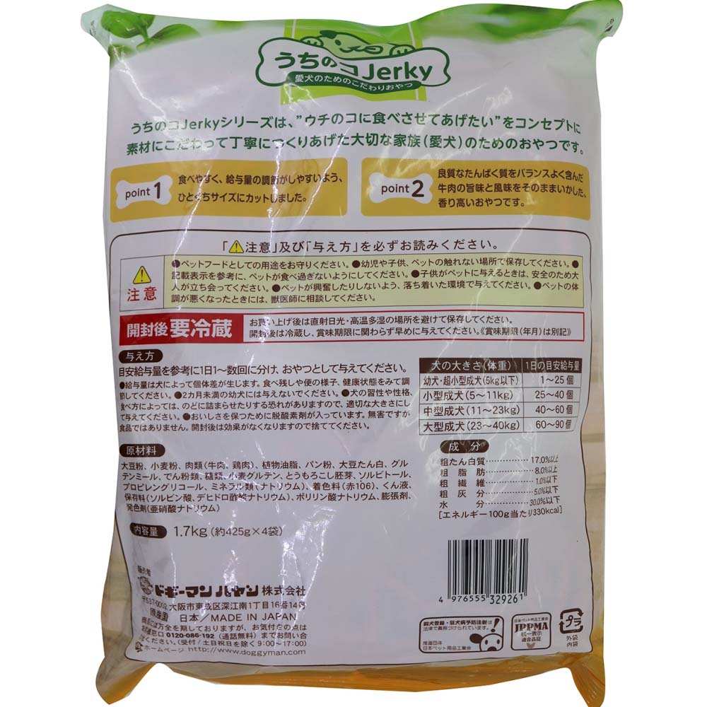 【サイズ】約幅280mm×高さ390mm×奥行50mm【特長】●食べやすく、給与量の調節がしやすいよう、ひとくちサイズにカットしました。●良質なたんぱく質をバランスよく含んだ牛肉の旨味と風味をそのままいかした、香り高いおやつです。【仕様】●サイズ:約幅280mm×高さ390mm×奥行50mm●重量・質量:1,750g●内容量:1.7kg●材質:大豆粉、小麦粉、肉類(牛肉、鶏肉)、植物油脂、パン粉、大豆たん白、グルテンミール、でん粉類、糖類、小麦グルテン、とうもろこし胚芽、ソルビトール、プロピレングリコール、ミネラル類(ナトリウム)、着色料(赤106)、くん液、保存料(ソルビン酸、デヒドロ酢酸ナトリウム)、ポリリン酸ナトリウム、膨張剤、発色剤(亜硝酸ナトリウム)●成分:粗たん白質:17.0%以上、粗灰分:5.0%以下、粗脂肪:8.0%以上、水分:30.0%以下、粗繊維:1.0%以下●原産国:日本【使用上のご注意】●ペットフードとしての用途をお守りください。●幼児や子供、ペットの触れない場所で保存してください。●記載表示を参考に、ペットが食べ過ぎないようにしてください。●子供がペットに与えるときは、安全のため大人が立ち会ってください。●ペットが興奮したりしないよう、落ち着いた環境で与えてください。●ペットの体調が悪くなったときには、獣医師に相談してください。