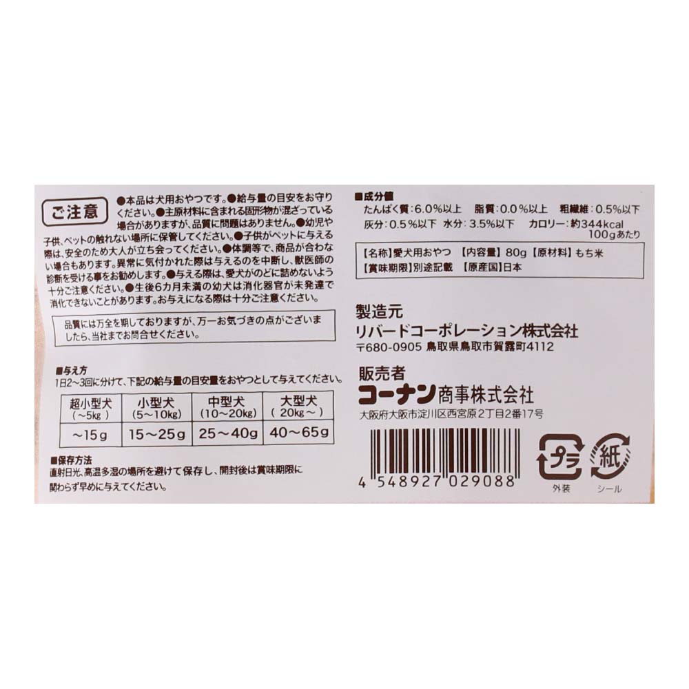 【特長】ご褒美やしつけに最適な国産スナックおやつ【仕様】●愛犬用おやつ●サイズ:幅140×高さ240×奥行20(mm)●重量:85g●内容量:80g●材質:もち米【成分】●たんぱく質:6.0%以上●脂質:0.0%以上●粗繊維:0.5%以下●灰分:0.5%以下●水分:3.5%以下●エネルギー:約344kcal(100gあたり)●生産国:日本●原産国:日本【使用上のご注意】●本品は犬用おやつです。●給与量の目安をお守り下さい。●主原材料に含まれる固形物が混ざっている場合がありますが、品質には問題ありません。●幼児や子供、ペットの触れない場所に保管して下さい。●子供がペットに与える際は、安全のため大人が立ち会って下さい。●体調等で商品が合わない場合もあります。異常に気付かれた際は与えるのを中断し、獣医師の診断を受ける事をお勧めします。●与える際は、愛犬がのどに詰めないよう十分ご注意下さい。●生後6ヶ月未満の幼犬は消化器官が未発達で消化できないことがあります。お与えになる際は十分ご注意下さい。【備考】●与え方:1日2〜3回に分けて、給与量の目安量をおやつとして与えて下さい。●給与量:超小型犬(〜5kg):〜15g小型犬(5〜10kg):15〜25g中型犬(10〜20kg):25〜40g大型犬(20kg〜):40〜65g●賞味期限:別途記載●保存方法:直射日光、高温多湿の場所を避け、開封後は賞味期限に関わらず早めに与えて下さい