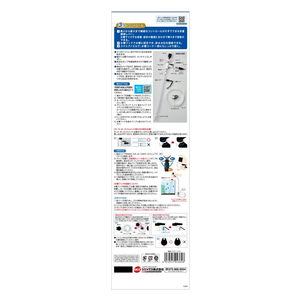 【特長】●コントロール自在の水換え&底砂掃除!●3つのコントロール 1.広い流量調節幅 片手で操作 2.水槽フックで排水ラインを調節 3.スクエアノズルで水槽コーナーもしっかり掃除●最大パイプ長 45cm(スクエアノズル装着時)●2つのシリコン弁 汚れた水の逆流を抑える●抜群の排水パワー●水槽の高さ45cmまで(幅60cm〜大型水槽)【仕様】●最小から最大まで繊細なコントロールが片手でできる流量調節レバー。●水槽サイズや水容量、底砂の種類に合わせて隅々まで掃除ができる。●水槽フックで水槽に固定でき、排水水位を調節できる。●スクエアノズルで、水槽コーナー部にもしっかり届く。●2つのシリコン弁で汚れた水の逆流を防ぎます。●細かく分解できるので、メンテナンスしやすい。●排水はポンプを数回押すだけで簡単スタート。●長めのパイプなので、底砂がたっぷり入った水槽でも奥までしっかり差し込んで、底砂の中まで掃除ができます。●排水ホースをバケツに固定するホースクリップ付き。排水中にホースがうっかりバケツから出るのを防ぎます。●サイズ:幅135×奥行75×高さ455(mm)●重量・質量:335g●材質:PVC、ABS●生産国:中華人民共和国●原産国:中華人民共和国