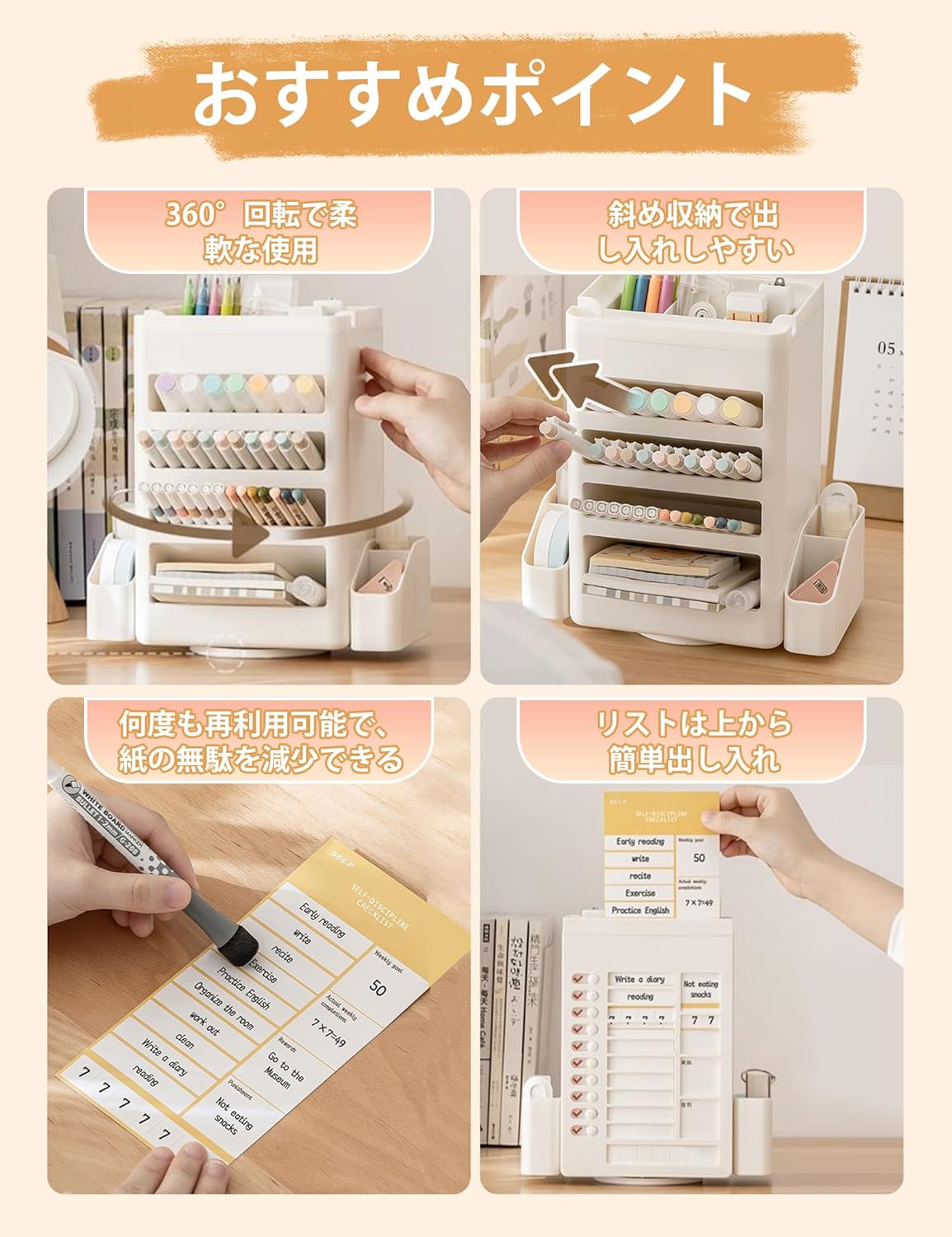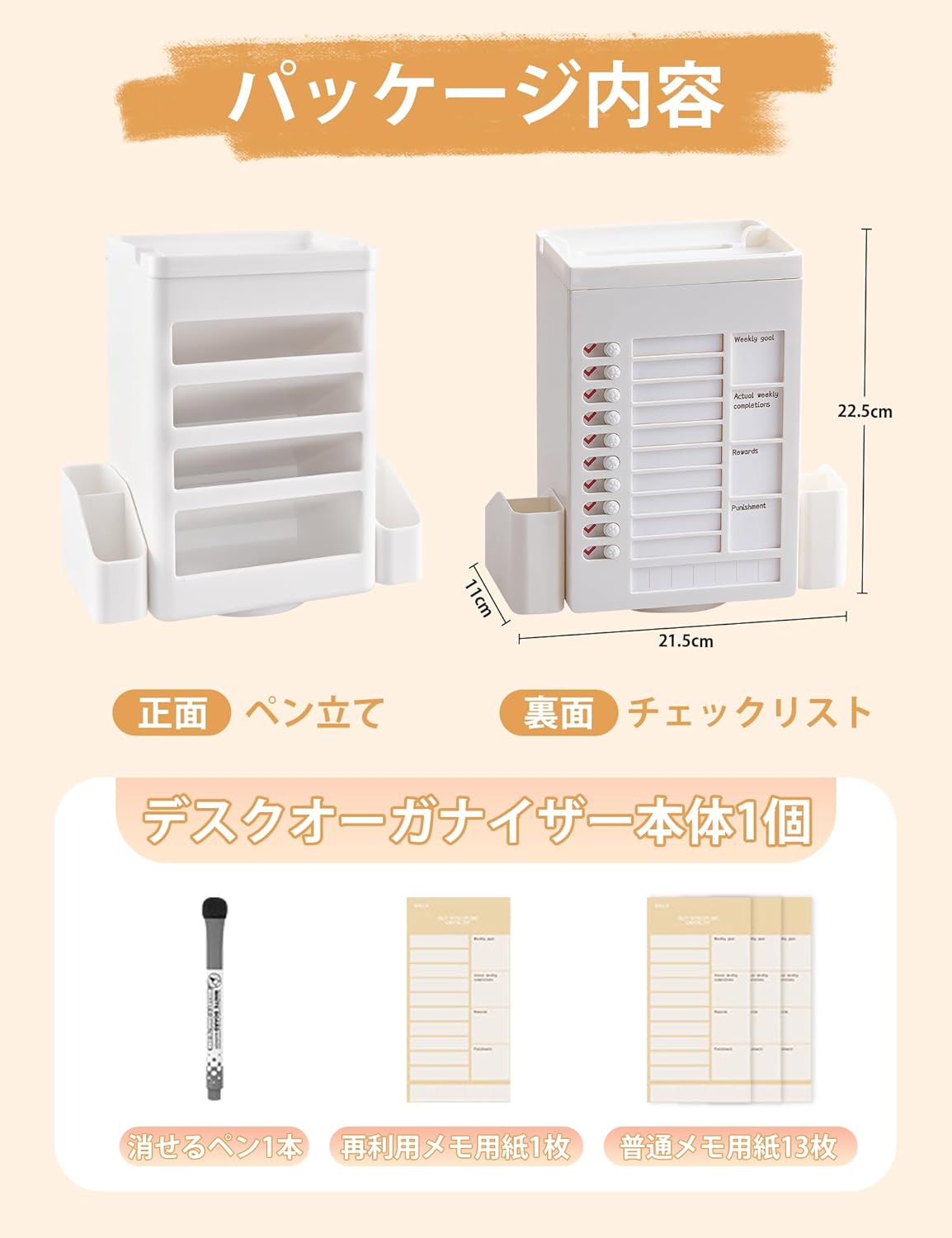 ✏【3in1デスク収納ボックス】物置トレー、筆立て、チェックリストを一体化したデスクオーガナイザーです。サイズ:21.5cm×22.5cm×11cm。パッケージ内容:デスクオーガナイザー本体1個、消せるペン1本、再利用メモ用紙1枚、普通メモ用紙13枚。 ✏【斜め差しペンホルダー】実用的な45度の斜めデザインで、ペン、文房具、化粧ブラシなどをはっきりと見えて出し入れが便利です。収納と取り出しには時間かかずに、勉強と仕事の効率向上とつながり、学校と職場でよくご利用されるデスク周り便利グッズです。 ✏【やりたいことリスト付き】360度回転するとチェックリストです。良い習慣を養うために、1日を通してやるべきことのリストを作成したり、時間を計画したり、1日の時間を最大限に活用したり、効率を向上させたりすることが可能です。忘れ物もわかりやすくチェック! ✏【大容量卓上ラック】:11格の収納空間付き、ペン、鉛筆、マーカー、定規、消しゴム、ペーパークリッパなどの文房具を簡単に分類して収納できます。コンパクトなのに、収納力は想像以上です。散乱しがちな文房具を整理整頓でき、テーブルの周りの小さなアイテムを保管するために使用されます。 ✏【様々な場面で活躍】:オフィス、家庭、学校、ホテル、書斎、寮、リビング、教室、寝室など様々なシーンにご利用でき、欠かせない収納グーズです。優れた収納機能により、さまざまなアイテムをすばやく整理し、時間を節約し、作業効率を向上させ、デスクトップを整頓できます。