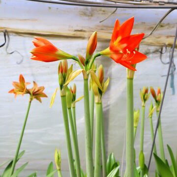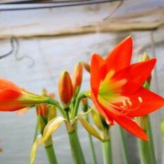 緑目と花弁の橙とのコントラストが絶妙!高性でありながら小輪の目を惹くノノレタ、是非お手元でお楽しみください。 学名 Hippeastrum Nonoreta 原産地 中南米 花期 4~5月 草丈 50〜60cm 耐寒性 中(5℃程度) 耐暑性 強 日照 日当りを好みます。 特徴・用途など − 管理 ★アマリリスは熱帯の植物です。寒い時期に水をあげると球根が腐敗するので注意が必要です。 このポイントさえ押さえれば、病虫害にも強く、誰でも簡単に栽培できます!★ 《鉢植えの場合》 ●植え付け ・大輪は6号鉢に1球、中輪〜小輪は4〜5号鉢に1球植え付けます。 ・元肥の緩効性化成肥料を施した、水はけの良い用土 (赤玉土2:腐葉土1:バーミキュライト1など)を鉢に入れ、球根の肩が出るくらいに浅く植えます。 1.一時的でも室温が10℃以下に下がるような室内の場合 ・鉢に植え付け後、冬の間は水をあげないでください。水やりをすると球根が腐敗する可能性があります。 ・春先の木々の芽吹きの時期、遅霜の心配がなくなってから水やりを開始します。 2.常に15℃以上の明るい室内や温室で管理する場合 ・植え付け後に20℃くらいの温かい水で十分に水をあげます。 ・気温が15℃以下にならないよう、管理します。 ・葉または蕾が出てきたら、水やりを開始します。 ※冬期以外の植え付けは、球根がお手元に届き次第、なるべく早く行ってください。 ●水やり ・蕾や茎が出てきたら、水やりを再開します(球根に直接水をかけないようにしてください)。 ・表土を触ってカラカラに乾いたら水を与えます。葉には時折シャワーのように水をかけます。 ●開花後の管理 ・開花後は、種子を採る場合以外は速やかに株元から花茎を切り落とし、球根を充実させます。 ・風通しの良い、なるべく高温多湿の場所で管理します。盛夏は午前中以降半日陰で管理します。 ・葉の生育期はカリ分の多い液肥を月に2〜3回、水やり代わりに行います。葉が黄変してきたら葉を株元から切り取り、水やりを止めます。 ・冬は土が凍らない場所(5℃以上が目安)で保管してください。 ----------------------------------------------------------------------------------- 《庭植えの場合》 ●植え付け ・午前中に日の当たる、風通し・水はけの良い場所に、遅霜の心配がなくなってから植え付けます。 ・土を耕し、腐葉土・草土灰・緩効性肥料を施します。 ・球根の間隔が、大輪:30cm、中輪:10〜25cm、小輪:15〜20cmになるようにして、球根の肩が出るくらいに浅く植えます。 ・植え付け後に十分水をあげた後は、葉または蕾が出るまで水やりを行わないようにします。 ●開花後の管理 ・庭植えで冬に掘り上げない場合は、気温が下がってきたら水やりを止め、葉を根元から切り取り、土や腐葉土をかけて保温して冬越しします。 ・掘り上げる場合は、葉を株元から切り取った後、降霜前に掘り上げます。土を取り除いて室内の暖かい場所に1週間ほど置いたあと、段ボール箱や木箱などにバーミキュライトを敷き詰めて球根を埋め、5℃以下にならない場所で凍らないように管理します。 発送状態 1球を掘り上げて発送いたします。球根の植え付け・保管については、上記の「管理」欄をご参照ください。 ●●2012年3月27日現在●● 日中の気温が高くなってきており、品種によっては花芽が伸びてきています。 その場合、花芽がごく短く、出荷に問題がない場合は花芽を付けてお送りいたします。 花茎が長く伸びている場合は、花茎を切ってお送りすることになり、開花は来シーズン以降となります。何卒ご了承ください。いずれの場合も、お手元に届きましたらなるべく早く植え付けを行ってください。