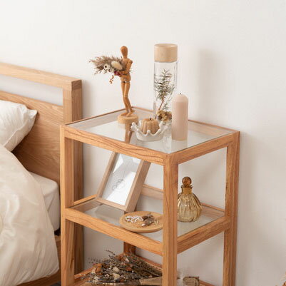 サイズ W40×D30×H75 材質 天然木化粧繊維板(ミンディ) 天然木(ミンディ) ラタン ラッカー塗装 5mm強化ガラス 注意事項 ※個体差あり 組立 完成品 原産地 インドネシア ※ ナチュラル×クラシカルな雰囲気を演出 天然木とラタンを使用したナチュラルなイメージのデザインながら、ターンドレッグ(ろくろ脚)を採用することで、クラシカルな雰囲気も感じられるオープンシェルフ&サイドテーブル。ガラス天板で抜け感もあり、使いやすいサイズ感も魅力です。