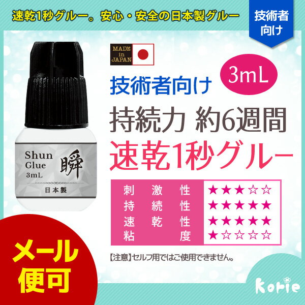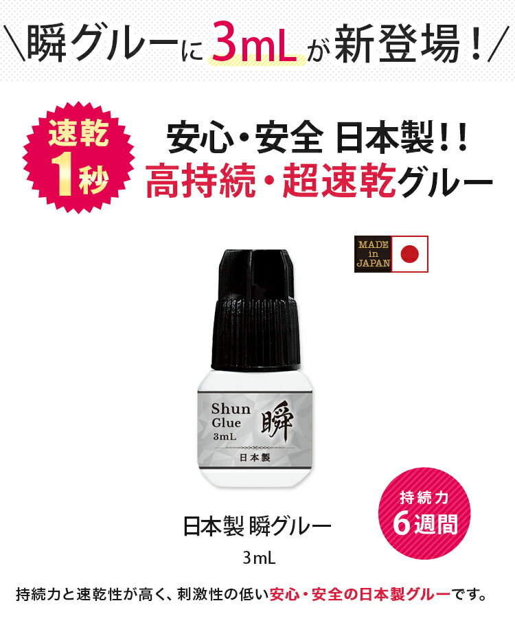 まつげエクステ 眉毛エクステ 超速乾 日本製 瞬グルー3ml(保存袋付)(メール便可) 国産 エチル 1秒硬化 完全硬化1時間 まつ毛エクステ プロ用 業務用 マツエク