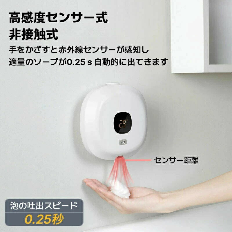 【オートソープディスペンサー&非接触】高感度赤外線センサーの搭載により、手をかざすと約0.25秒という高速で泡が吐出される、ストレスフリーなソープディスペンサーです。センサーの反応距離は約5~7cm。お肉や魚を触った手でボトルに触れずに洗剤が出てくるので、とても衛生的で便利です。食器洗剤、シャンプー、洗顔料など、さまざまな洗剤に対応しているので、複数個まとめて購入するのもおすすめです。感染予防対策に、柔らかな泡が気持ちよく、毎日の手洗い食器洗い時間も快適になるでしょう。【洗剤は泡液体両方に対応&大容量300ml】泡用の洗剤だけではなく、液体タイプの洗剤も泡立てて噴射することができるソープディスペンサー。液体タイプは2~8倍に希釈して使用可能。泡タイプはおススメで、そのまま使用します。タンクは大容量の300mlと、約500回使用可能で家族全員で毎日手洗いをしてもじっくり使えます。そのため、頻繁に洗剤を足す必要がなく、手間なく使用することができます。ボトル部を半透明にしたことで残量を確認できるうえ、どんな色のソープを入れてもデザイン性を損なわないのはうれしいです。【洗浄モード&IPX4防水】本製品は内部洗浄機能が搭載されています。タンク内を空にして、水を入れます。電源が入っている状態で、電源スイッチに素早く3回タッチすると、約10秒間連続で中の水が排出されます。水を通すことで配管内が清浄され、パーツを分解して手洗いする手間が省けます。IPX4防水性能で、風呂や台所での使用でも安心。【充電式&場所を取らない直置き壁掛け兼用】経済的に使える充電タイプのオートディスペンサーです。手持ちのACアダプターを使えば、コンセントからも手軽に充電できます。また1200mAバッテリ付いて、満充電で1日に約10回使用した場合の連続使用目安は約3カ月なので、こまめな充電も必要ありません。壁掛けフックが付属されているので、ツルツルしてる壁や鏡なら掛けることもできます。フックつきフィルムを壁にペタっとくっつけて本体をカチッとはめます。ソープディスペンサーの設置場所がないと悩んでいる人でも安心して導入できます。【オートソープディスペンサー&非接触】高感度赤外線センサーの搭載により、手をかざすと約0.25秒という高速で泡が吐出される、ストレスフリーなソープディスペンサーです。センサーの反応距離は約5~7cm。お肉や魚を触った手でボトルに触れずに洗剤が出てくるので、とても衛生的で便利です。食器洗剤、シャンプー、洗顔料など、さまざまな洗剤に対応しているので、複数個まとめて購入するのもおすすめです。感染予防対策に、柔らかな泡が気持ちよく、毎日の手洗い食器洗い時間も快適になるでしょう。【洗剤は泡液体両方に対応&大容量300ml】泡用の洗剤だけではなく、液体タイプの洗剤も泡立てて噴射することができるソープディスペンサー。液体タイプは2~8倍に希釈して使用可能。泡タイプはおススメで、そのまま使用します。タンクは大容量の300mlと、約500回使用可能で家族全員で毎日手洗いをしてもじっくり使えます。そのため、頻繁に洗剤を足す必要がなく、手間なく使用することができます。ボトル部を半透明にしたことで残量を確認できるうえ、どんな色のソープを入れてもデザイン性を損なわないのはうれしいです。【洗浄モード&IPX4防水】本製品は内部洗浄機能が搭載されています。タンク内を空にして、水を入れます。電源が入っている状態で、電源スイッチに素早く3回タッチすると、約10秒間連続で中の水が排出されます。水を通すことで配管内が清浄され、パーツを分解して手洗いする手間が省けます。IPX4防水性能で、風呂や台所での使用でも安心。【充電式&場所を取らない直置き壁掛け兼用】経済的に使える充電タイプのオートディスペンサーです。手持ちのACアダプターを使えば、コンセントからも手軽に充電できます。また1200mAバッテリ付いて、満充電で1日に約10回使用した場合の連続使用目安は約3カ月なので、こまめな充電も必要ありません。壁掛けフックが付属されているので、ツルツルしてる壁や鏡なら掛けることもできます。フックつきフィルムを壁にペタっとくっつけて本体をカチッとはめます。ソープディスペンサーの設置場所がないと悩んでいる人でも安心して導入できます。