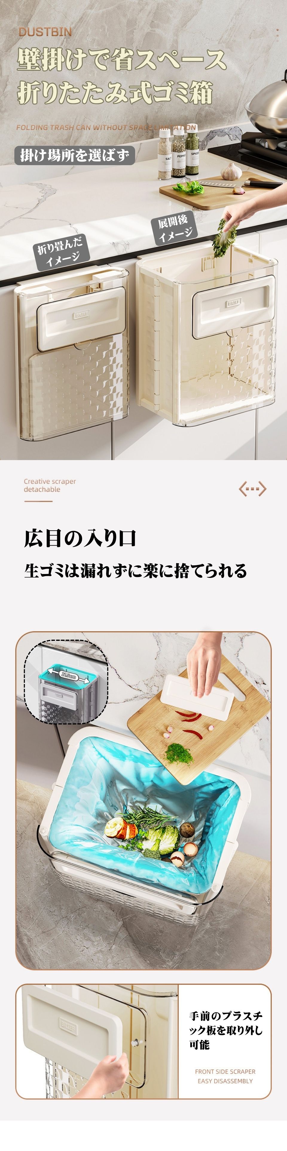 商品情報 商品名 折りたたみ式引っ掛けゴミ箱 サイズ 幅23.5cm*奥行き17.5cm*高さ27.7cm 素材 プラスチック カラー ベージュ/グレー/グリーン 商品説明 ※ 取り外し便利なフック式のデザイン。 ※ 穴あけ不要、簡単設置、実用的な折り畳み式壁掛けゴごみ箱です。 ※ これでゴミがあなたの台所の貴重な床面積を占めることはありません。 ※ もちろん床に置いても大丈夫です。 ※ 使用しない時には、折り畳んでさらにコンパクト。 注意事項 ※ お客様のご覧になっているモニター等により多少色が異なる場合がございます。 ※ 実測サイズなので、実際発送の製品に多少異なる場合もございます。予めご了承の程よろしくお願いします。