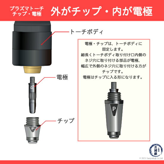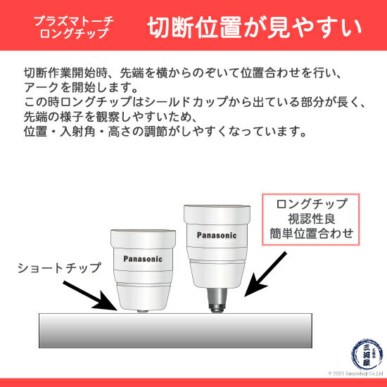切断位置が見やすい 切断作業開始時、先端を横からのぞいて位置合わせを行い、アークを開始します。この時ロングチップはシールドカップから出ている部分が長く、先端の様子を観察しやすいため、位置・入射角・高さの調節がしやすくなっています。 外がチップ・内が電極 電極・チップは、トーチボディに固定します。 細長くトーチボディ取り付け口内側のネジ穴に取り付ける部品が電極、幅広で外側のネジ穴に取り付ける方がチップです。 電極はチップに入る形になります。 店長のオススメPoint Panasonic ( パナソニック ) 純正 プラズマ切断トーチ ロングチップ 35A TET00003 10個 YT-03PD3用です。 チップは切断作業時、母材に接触します。プラズマアークにより溶けた金属が付着し劣化していくため、プラズマ切断トーチの中では消耗が激しい部品です。 早めの交換をおすすめします。 本商品はメーカー最小販売単位通りの10個売りになりますが、お試しで使ってみたい、作業頻度が少なく10個は使いきれない、という声にお応えして1個からのばら売りもご用意しております。 商品詳細 Panasonic ( パナソニック ) 純正 プラズマ切断トーチ ロングチップ 35A TET00003 10個 YT-03PD3用です。 ロングチップは、シールドカップから飛び出し、切断部分を確認しながら切断ができます。 エアプラズマ切断作業を実施する際、使用電流に合ったアークを発生させるため、チップによって穴の大きさが異なります。 設定電流に合ったチップをご使用ください。35A用チップの穴径は φ1.1mm です。 本商品はロングチップです。対応するロング電極を使用してください。 使用可能切断トーチ YT-03PD3 YT-03PD3CB0 YT-03PD3CC0 YT-03PD2 YT-03PD2CB0 YT-03PD2CC0 YT-03PE3 YT-03PE3CB0 YT-03PE3CC0 YT-03PE2 YT-03PE2CB0 YT-03PE2CC0 使用可能切断機 YP-035PF3 YP-030PA2 ( PA35 ) おすすめ商品