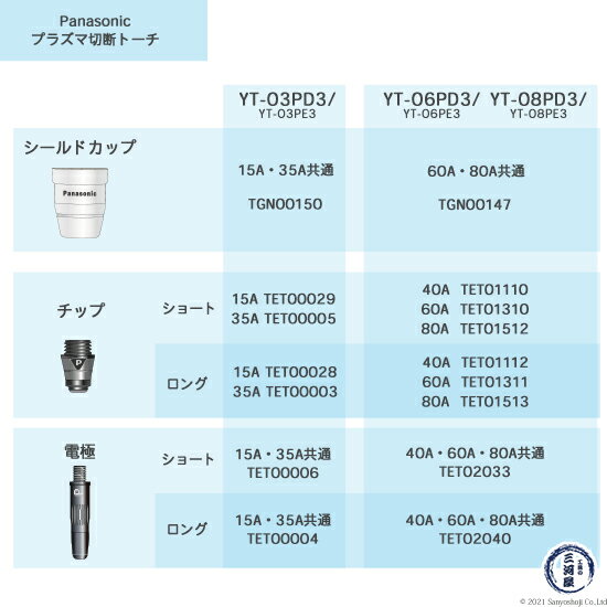 シールドカップ・チップ・電極組み合わせ トーチに取り付けるシールドカップ、チップ、電極はトーチによって異なります。 ご使用のトーチ型番をご確認ください。 外がチップ・内が電極 電極・チップは、トーチボディに固定します。 細長くトーチボディ取り付け口内側のネジ穴に取り付ける部品が電極、幅広で外側のネジ穴に取り付ける方がチップです。 電極はチップに入る形になります。 店長のオススメPoint Panasonic ( パナソニック ) 純正 プラズマ切断トーチ ショートチップ 60A TET01310 ばら売り1個 YT-06PE3用です。 チップは切断作業時、母材に接触します。 プラズマアークにより溶けた金属が付着し劣化していくため、プラズマ切断トーチの中では消耗が激しい部品です。 早めの交換をおすすめします。 メーカー最小販売単位は10個からになりますが、お試しで使ってみたい、作業頻度が少なく10個は使いきれない、という声にお応えして1個からご用意しております。 商品詳細 Panasonic ( パナソニック ) 純正 プラズマ切断トーチ ショートチップ 60A TET01310 ばら売り1個 YT-06PE3用です。 エアプラズマ切断作業を実施する際、使用電流に合ったアークを発生させるため、チップによって穴の大きさが異なります。 設定電流に合ったチップをご使用ください。 60A用チップの穴径は φ1.3mm です。 本商品はショートチップです。対応するショート電極を使用してください。 使用可能切断トーチ YT-06PD3 YT-06PD3CB0 YT-06PD3CC0 YT-06PD3TAE YT-06PE3 YT-06PE3CB0 YT-06PE3CC0 YT-06PD2 YT-06PD2CB0 YT-06PD2CC0 YT-06PE2 YT-06PE2CB0 YT-06PE2CC0 YT-08PD3 YT-08PD3CB0 YT-08PD3CC0 YT-08PDA3 YT-08PDA3CB0 YT-08PDA3CC0 YT-08PE3 YT-08PE3CB0 YT-08PE3CC0 YT-08PD2 YT-08PD2CB0 YT-08PD2CC0 YT-08PDA2 YT-08PDA2CB0 YT-08PDA2CC0 YT-08PE2 YT-08PE2CB0 YT-08PE2CC0 使用可能切断機 YP-060PF3 YP-080PF3 YP-060PA2 ( PA60 ) YC-200TRCT00 おすすめ商品