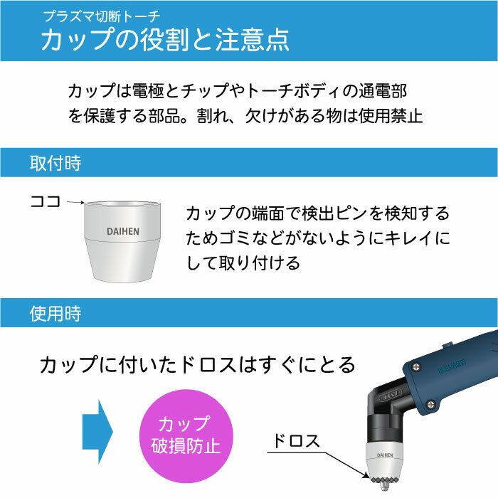 プラズマ切断トーチ シールドカップ カップは先端部品の保護と起動信号を検出する二つの重要な役割があります。 トーチボディに接するカップ端面は金属膜付けされていて、検出ピンをしっかり押すことで本電流が流れるようになっています。使用中は切断で発生するドロスがカップに付くことがありますが、カップの破損を防止するためにドロスはなるべく早く除去することが重要です。 シールドカップ 適応トーチ比較表 ダイヘン プラズマ切断トーチ用のシールドカップには取り付けるトーチによって大きさの違う二種類があります。ご使用のトーチに合わせて選定してください。15-35A共通 H705F03 カップ幅 22mm 50-70A共通 H669G04 カップ幅 26mm 店長のオススメPoint ダイヘン (daihen) プラズマトーチ部品 カップ H705F03 ばら売り 1個 CT-0351用です。シールドカップ、絶縁カップ、カバーなど色々な呼び方をされる部品です。カップはエアプラズマ切断でトーチ先端を保護する重要なパーツです。ぶつけるとすぐに割れてしますので注意が必要です。欠けたり割れてしまったらすぐに交換しましょう。トーチによって大きさが違うのでご使用のトーチに合ったカップをお選びください。こちらは少量必要な方に便利なばら売り1個の商品です。よく使われる方には送料無料の5個/箱がおすすめです。またトーチ1式の商品も取り扱っていますのでよろしければそちらもご利用ください。 商品詳細 DAIHEN(ダイヘン)純正 プラズマ切断トーチ部品 シールドカップ H705F03 ばら売り 1個 切断トーチ CT-0351用です。エアプラズマ切断をする際に、15-35A用のトーチに取り付ける白いセラミック製の絶縁カップです。カップはプラズマ切断トーチの先端に取り付け、電極やチップ、トーチボディの通電部を保護しながら絶縁をする部品です。カップをしっかりと取り付けることで検出ピンが押し込まれ、切断するための本電流が流れるようになっています。使用可能切断機 M-1500C、M-3500/C/CⅡ、DCT35/C C-30、V-30、D-3000、M-3000/C使用可能切断トーチ CTL-0151、CT-0351、CTL-0351、CTP-0351、CT-0302、CTL-0302、CTP-0302 ※カップは衝撃に弱いためぶつけると割れてしまいますのでご注意ください