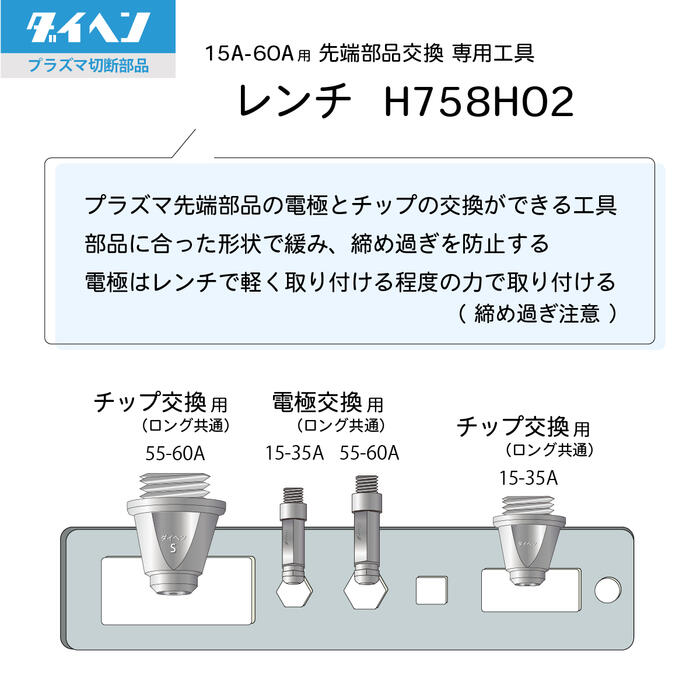 プラズマ切断トーチ用 レンチ H758H02 プラズマ切断トーチ付属のレンチは電極とチップを適切に交換するための工具です。 切断トーチによって2種類のレンチがあります。 H690G01 15A-35A用 全長 約65mm スパナ型 H758H02 15A-60A用 全長 約80mm ストレート型※メーカー在庫が無くなり次第、15A-60A用のH758H02に統一されます。 プラズマ切断トーチ 先端部品の組み合わせ表 15A-35A用のトーチに使用できる先端部品は左記イラストのような組み合わせです。シールドカップと電極はすべて共通で使用でき、チップのみ15A用と35A用のトーチで分かれています。 チップと電極は長さの違いで標準とロングがあります。標準電極は標準チップ、ロング電極はロングチップというように、長さをそろえてセットで使用してください。 店長のオススメPoint ダイヘン (daihen) プラズマトーチ部品 レンチ H758H02 1個 CTL-0351用です。電極とチップを交換する専用の工具です。小さくて複雑な形状のチップと電極にぴったりとフィットするレンチです。サイズの合わないモンキーなどで交換すると締め過ぎや部品を潰してしまう恐れがあるのでレンチを使うことをお勧めします。気づくと無くなってしまいがちな工具ですが、消耗品と一緒に置いておきましょう。当店ではプラズマ切断に必要な部品を多数在庫していますのでぜひご覧ください。 またトーチ1式の商品も取り扱っていますのでよろしければそちらもご利用ください。 商品詳細 DAIHEN(ダイヘン)純正 プラズマ切断トーチ部品 レンチ H758H02 1個 切断トーチ CTL-0351用です。電極とチップの交換に使用する専用工具です。エアプラズマ切断部品のレンチは交換頻度の高い電極とチップに合わせた形状になっています。 四角い穴がチップ交換用、六角形の穴が電極用になります。 チップ、電極用の穴が、それぞれ15A-35Aと55A-60Aに大小で分かれています。 電極はレンチで軽く締め付ける程度で取り付けます。(締め過ぎに注意)大きなモンキーなどで掴むと、過剰なトルクが掛かったり、部品を潰してしまう恐れがあるのでこちらのレンチをお勧めします。使用可能切断機 M-1500C、M-3500/C/CⅡ、DCT35/C C-30、V-30、D-3000、M-3000/C使用可能切断トーチ CTL-0151、CT-0351、CTL-0351、CTP-0351、CT-0302、CTL-0302、CTP-0302※レンチ H758H02はH690G01の後継品になります。