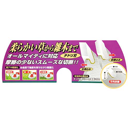 【特長】 ●チドリ刃で摩擦の少ないスムーズな切断が可能です ●台金窓を設け強度を保ちながら、軽量化しました ●チップは斜め埋め込みで、飛びにくく作業者に安全です ●雑草刈・笹刈・小枝刈に最適です ●JIS規格品です 【用途】 ●草刈り・刈払い作業 【仕様】 ●外径:230mm ●刃数:44P ●刃厚:1.65mm ●穴径:25.4mm ●台金厚:1.25mm ●刈払機推奨排気量:25cc未満 ●最高級超硬チップ使用 ●JIS規格適合商品 ●商品サイズ:幅230×高さ230×奥行き5mm ●重量:300g 【納期】 メーカーに在庫があれば、納期約3〜4日(営業日)で出荷いたします。 画像clickで各商品販売ページに進みます オールマイティーチップソー 230mmx44p 255mmx48p