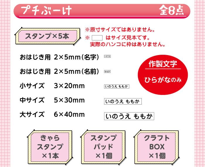 プチぶーけ<セット内容> おなまえスタンプ5本(素材:カラーボード) きゃらスタンプ1本(素材:トップウッド) スタンプパッド1個 クラフトBOX1個こちらも好評販売中!ぜひ、こちらもチェックしてくださいね!