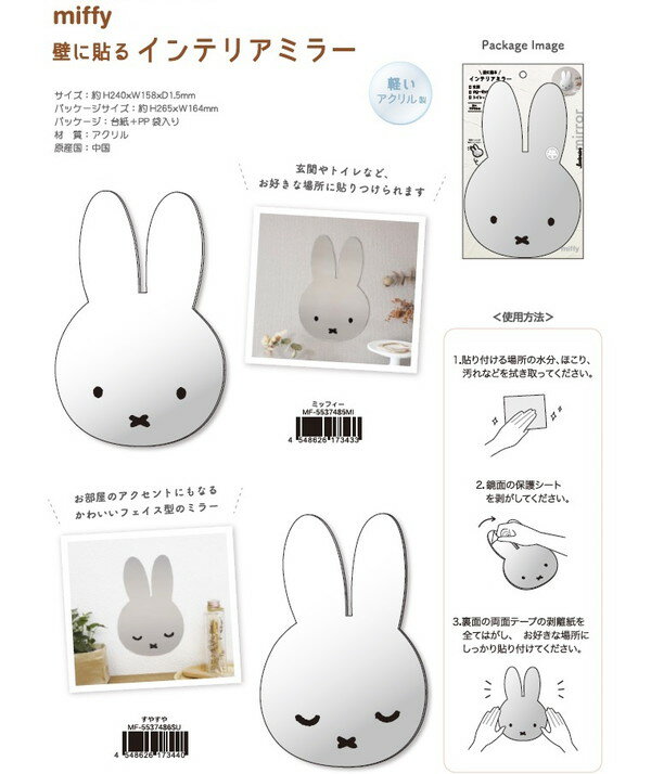 壁に貼る ミッフィー(うさぎ・すやすや)スヌーピー、コジコジ インテリアミラー【公式ライセンス商品】ミッフィー鏡 miffy フェイス型のミラー アクリル製