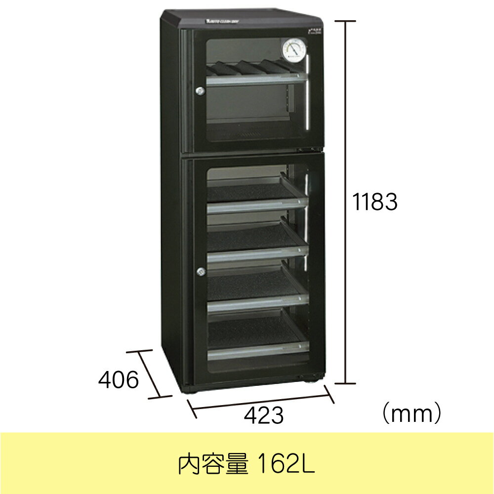 ・耐久性抜群の日本製電子ドライユニット搭載・光触媒と可視光LEDで庫内をクリーンに保持・タッチセンサー式スイッチのLEDバーライト※画像はイメージです。独自開発の高品質な電子ドライユニットオートクリーンドライは光触媒機構の電子ドライユニット (独自開発の 日本製)を搭載。庫内の湿度を下げるのはもちろん、光触媒シートに常時 可視光 LED を照射することで、消臭、抗菌、防カビ作用 が連続して行われ、庫内をクリーンな状態に保ちます。庫内湿度を30%〜50%を任意に設定可能でき、レンズのカビと電子部品の劣化防止にメンテナンスフリーで安定した除湿性能を発揮する全自動防湿庫。ユニットは5年保証。LEDバーライト&庫内コンセント作業時に傷つきにくい樹脂製トップテーブルと充電可能な庫内コンセントを採用。レンズホルダーも付属した出し入れに便利な引出棚も採用。全面ガラスと一体取っ手のすっきりとした扉の縦型のスタンダードシリーズのブラックボディは、発売以来のベストセラーモデル。2枚扉の大容量162リッタータイプ。お取り寄せの場合は、ご注文受付後にメーカーへ商品の手配を行います。万が一商品確保ができない場合は、ご案内を差し上げキャンセルをさせていただく場合がございます。ご了承いただいた上でご注文をお願いいたします。●庫内湿度:30〜50%RH●外寸 W×H×D:423×1183×406mm●内寸 W×H×D:417×371(上)・722(下)×344mm●内容量:162L●重量:26kg●定格消費電力:15W●平均消費電力:0.9W●定格電圧:AC100V(50/60Hz)●プラグ形状:2Pプラグ●電源コード:長さ:2m●製品材質:本体:スチール(粉体焼付塗装) 天板:ABS樹脂 扉:強化ガラス●棚:引き出し棚内寸:W345×H35×D275mm 耐荷重:12kg/枚(分散荷重) 可変ピッチ:26mm●装備:引き出し棚×5、波形レンズホルダー、アナログ湿度計、 庫内コンセント、LEDバーライト×2●付属品:鍵×2