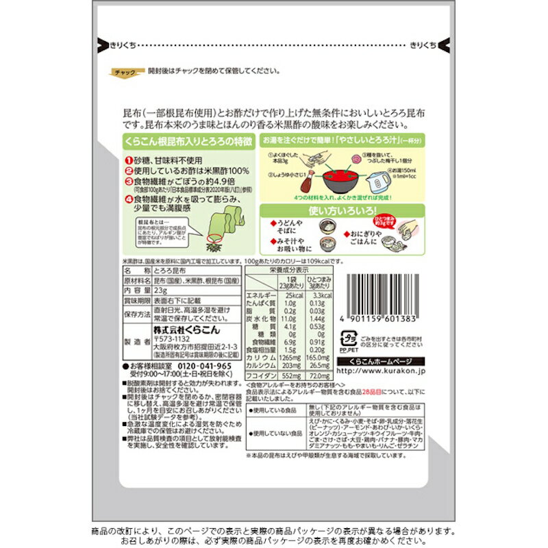 【くらこん】根昆布入りとろろ 23g ●素材のおいしさを味わっていただくために、昆布とお酢だけで作り上げた無条件においしいとろろ昆布です。 ●厳選した国産昆布に、じっくり熟成した米黒酢を合わせ、昆布本来のうま味を大切に仕上げました。 ●よく使われる砂糖や甘味料も使用していません。