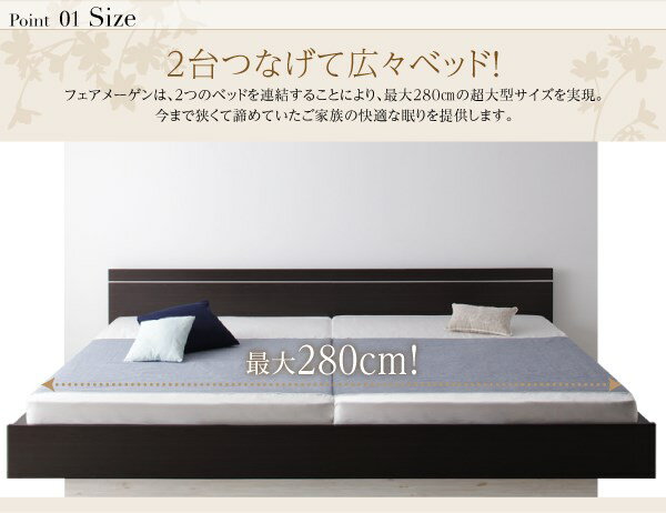 沖縄・離島へは配送いたしかねます。 ※ご注文後、3日〜5日以内に発送予定(土日祝日を除く) ※【銀行振込】【コンビニ決済】は、入金確認後、3日〜5日以内に発送予定(土日祝日を除く) (※12月〜04月迄の繁忙期は7営業日後の発送になる場合がございます) 出荷から納品までに2週間程度日数を要します。 ※配達日時の指定がお受けできません。 配達日は、配達店に到着後、配達店から電話連絡を行い決定いたします。 連絡が取れない場合は配送を行えませんのでご注意ください。 あらかじめご了承下さい。 ご購入の際はお部屋まで搬入できるかご確認ください。 【返品について】 不良または破損・汚れ等の場合以外の返品・交換はご対応できませんのでご注意くださいませ。 返品について詳しくはこちらをご覧ください。 ※実際の商品の色にできる限り近づけるよう撮影を行っていますが商品の色は、ご使用のモニター・ブラウザによって実際の明るさや色と多少異なって見える場合がございます。予めご了承ください。お部屋いっぱいをベッドに出来る! ◆連結できるフロアベッド◆ ▼サイズで選べる13タイプ ・セミシングル(SS) 約幅96×奥行200.5×高さ66cm ・シングル(S) 約幅105×奥行200.5×高さ66cm ・セミダブル(SD) 約幅125×奥行200.5×高さ66cm ・ダブル(D) 約幅145×奥行200.5×高さ66cm ・キング180(SS+SS) 約幅192×奥行200.5×高さ66cm ・ワイド190(SS+S) 約幅201×奥行200.5×高さ66cm ・ワイド200(S+S) 約幅210×奥行200.5×高さ66cm ・ワイド210(SS+SD) 約幅221×奥行200.5×高さ66cm ・ワイド220(S+SD) 約幅230×奥行200.5×高さ66cm ・ワイド230(SS+D) 約幅241×奥行200.5×高さ66cm ・ワイド240(SD+SD) 約幅250×奥行200.5×高さ66cm ・ワイド260(SD+D) 約幅270×奥行200.5×高さ66cm ・ワイド280(D+D) 約幅290×奥行200.5×高さ66cm 【マットレスで選べる4タイプ】 ・本体のみマットレス無し(国産) ・圧縮ボンネルコイルマットレス(中国産) ・圧縮ポケットコイルマットレス(中国産) ・SGマークポケットコイルマットレス(国産) ◆連結できるフロアベッド◆ ▼サイズ ・セミシングル(SS) 約幅96×奥行200.5×高さ66cm ・シングル(S) 約幅105×奥行200.5×高さ66cm ・セミダブル(SD) 約幅125×奥行200.5×高さ66cm ・ダブル(D) 約幅145×奥行200.5×高さ66cm ・キング180(SS+SS) 約幅192×奥行200.5×高さ66cm ・ワイド190(SS+S) 約幅201×奥行200.5×高さ66cm ・ワイド200(S+S) 約幅210×奥行200.5×高さ66cm ・ワイド210(SS+SD) 約幅221×奥行200.5×高さ66cm ・ワイド220(S+SD) 約幅230×奥行200.5×高さ66cm ・ワイド230(SS+D) 約幅241×奥行200.5×高さ66cm ・ワイド240(SD+SD) 約幅250×奥行200.5×高さ66cm ・ワイド260(SD+D) 約幅270×奥行200.5×高さ66cm ・ワイド280(D+D) 約幅290×奥行200.5×高さ66cm ▼マットレス面 (マットレス迄の)高さ ・中国産圧縮ロールボンネルコイルマットレス 約36cm ・中国産圧縮ロールポケットコイルマットレス 約36cm ・国産ポケットコイルマットレス 約38cm ▼主材 ・本体主材 プリント化粧板 ・組立て お客様組立て商品です。 ・生産国 安心のSG認定国内生産 ◆マットレスご使用上の注意点◆ ※ベッドのフレームはスプリングマットレス使用時の基準で強度計算されております。その為、床板に 直接布団等を敷いてご利用になりますと破損の原因となる場合があり大変危険です。 ◆この商品をご使用になられる場合は、床板に必ずスプリングマットレスを敷いてご利用くださいませ。 【マットレスの特徴と違い&スペック】 ◆中国産圧縮ロールボンネル&ポケットコイルマットレスはこちらをクリック! ◆SGマーク付国産ポケットコイルマットレスはこちらをクリック!