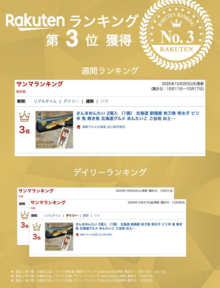 ★ご注意ください★ 沖縄県・離島には別途送料がかかります。 後日送料を変更したメールを送信させて頂きます。 名称 さんま加工品 販売業者 株式会社品川甚作商店 原材料 さんま、助宗鱈卵、発酵調味料、食塩、唐辛子/蛋白加水分解物、調味料(アミノ酸等)、ソルビット、酸化防止剤(V.C)、トレハロース、pH調整剤、甘味料(甘草、ステビア)、発色剤(亜硝酸等)、酵素、(一部に大豆を含む) 内容量 1個 2尾入り 発送温度帯 冷凍 賞味期限 解凍後はすぐにお召し上がりください 保存方法 要冷凍-18℃以下 栄養成分表示 (100g当たり) エネルギー 225kcal 蛋白質 17.1g 脂質 16.4g 炭水化物 2.2g 食塩相当量 6.6g ※この表示値は目安です。 取扱い上の注意 ●ご注文確定後のキャンセルは承ることができません。 ●商品の到着後すぐ商品の状態を確認してください。食べられないほどの潰れや傷みがある場合には、誠にお手数ですが、すぐにご連絡ください。 ●お客様のご都合による返品・交換の対応はできません。 ●お客様のご都合によって商品をお受け取りいただけない場合、送料・商品代をご負担いただきます。 【商品説明】 新鮮なさんまの干物にたっぷりと明太子を詰め込んだ人気商品です。 焼き上げると、さんまの脂がのった旨味と明太子の香ばしさが広がり、食欲をそそります。 外は香ばしく、中はジューシー。 さんまの上品な味わいと明太子のピリッとした風味が絶妙に調和し、ご飯のおかずはもちろん、お酒のおつまみとしても相性抜群。 冷凍保存が可能なので、食べたいときに手軽に調理できるのも魅力です。 北海道のお取り寄せグルメとしても人気が高く、贈り物やギフトとしても喜ばれる逸品。 釧路の港町からお届けする自慢の「さんまめんたい」をぜひご家庭でご堪能ください。 ■関連キーワード:北海道 さんまめんたい さんま 明太子 さんま明太 さんま干物 さんまめんたい干物 釧路 釧路港 北海道産 さんまグルメ 北海道お取り寄せ お取り寄せグルメ 北海道ギフト ご飯のお供 酒の肴 おつまみ 海鮮干物 海鮮グルメ 冷凍干物 干物ギフト 贈答用 北海道名物 焼き魚 北海道海鮮 関連商品【12/1限定20%OFFクーポン配布中!】さんまめんたい 2尾入 (...【12/1限定20%OFFクーポン配布中!】さんまめんたい 2尾入 (...4,870円3,680円【12/1限定20%OFFクーポン配布中!】さんまめんたい 2尾入 (...【12/1限定20%OFFクーポン配布中!】さんまめんたい 2尾入 (...7,250円13,200円【12/1限定20%OFFクーポン配布中!】北海道 釧路 釧之助 わさ...【12/1限定20%OFFクーポン配布中!】北海道 釧路 釧之助 ピリ...1,150円1,150円【12/1限定20%OFFクーポン配布中!】旨辛おつまみツブ貝 80g...【12/1限定20%OFFクーポン配布中!】焼つぶ浜煮 220g (1...1,200円1,200円【12/1限定20%OFFクーポン配布中!】釧之助 いかジャン辛 15...【12/1限定20%OFFクーポン配布中!】釧之助 秋鮭 おつまみ切身...1,180円1,180円