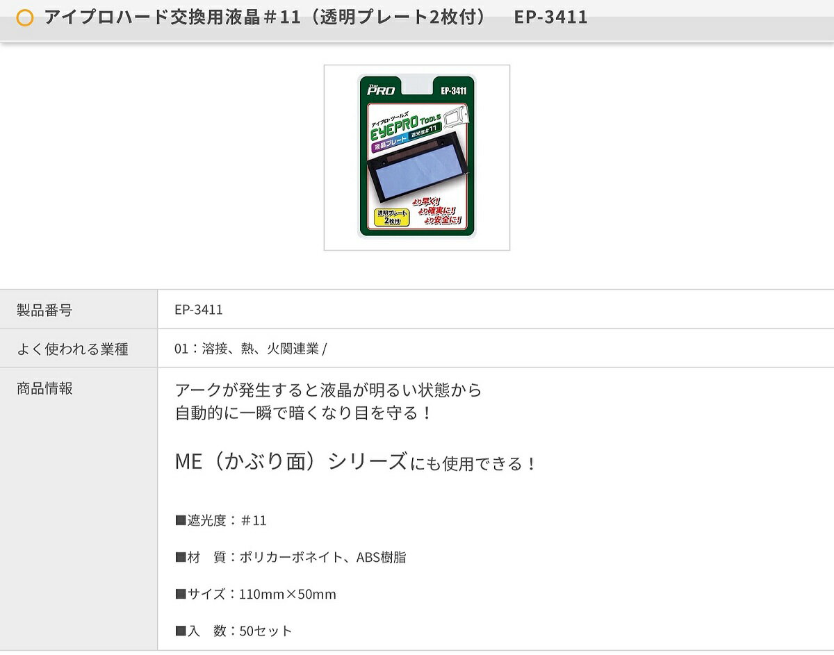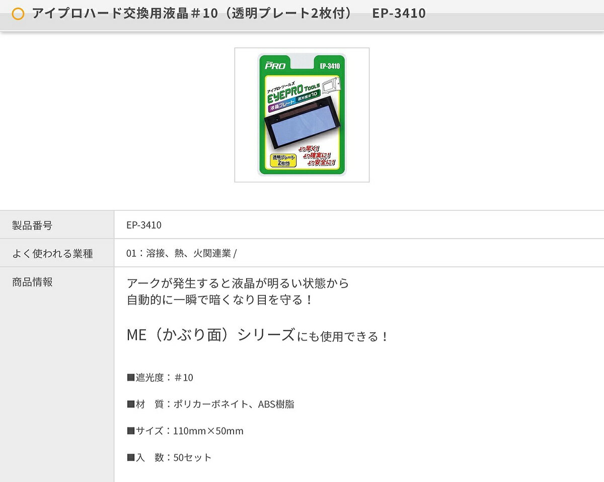 【アイプロハード交換用液晶】 ■品名:遮光プレート ■品番:EP-3410(遮光度#10)、EP3411(遮光度#11) ■サイズ:幅108×縦51×厚5(mm) ■視界範囲:91×36(mm) ■原材料:ポリカーボネイト,ABS樹脂 ■用途:溶接作業、熱、火関連業 【特徴】 ◎アークが発生すると液晶が明るい状態から自動的に一瞬で暗くなり目を保護します。 ◎ME(かぶり面)シリーズにも使用が可能です。 ◎透明プレート2枚付 ★かぶり面本体はコチラ↓↓↓★ 【OHNAKA ME-2α】 【OHNAKA ME-2】 【OHNAKA AME-6】 ※ご使用のモニター環境により、実際の色味と異なる場合がございます。予めご了承の上、お買い求めください。