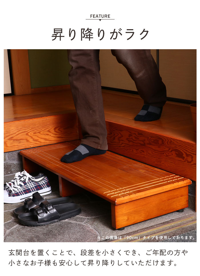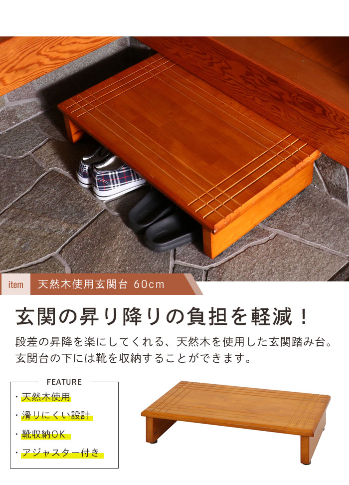 商品情報玄関などに設置することにより段差を小さくすることができる玄関台。ご年配の方の足や腰への負担を軽減し、また小さなお子様も安心して昇り降りができます。天板には滑り止め効果のある溝が彫ってあります。脚裏にはアジャスターが付いており、がたつきの細かな調節ができます。▼ 製品サイズ[本体]約幅60×奥行35×高さ13.5cmサイズ:60cm▼ 内寸[天板下高さ]約10.5cm▼ 重量約5kg▼ 耐荷重80kg▼ 材料■構造部材:天然木(ラバーウッド) ▼ 表面加工■表面加工:ラッカー塗装▼ 特徴・機能・あたたかみのある天然木を使用した丈夫な造り・滑り止め加工仕上げ・がたつき防止のアジャスター付き▼ 組立区分完成品(一部取付)▼ 生産国ベトナム▼ キーワード玄関台 幅60cm 玄関 台 踏み台 ステップ 玄関ステップ 幅60 奥行35 高さ13.5cm 段差 軽減 アジャスター付き 靴 収納 昇降台 足場 転倒防止 介護 歩行支援 高齢者 補助具 ペット おしゃれ