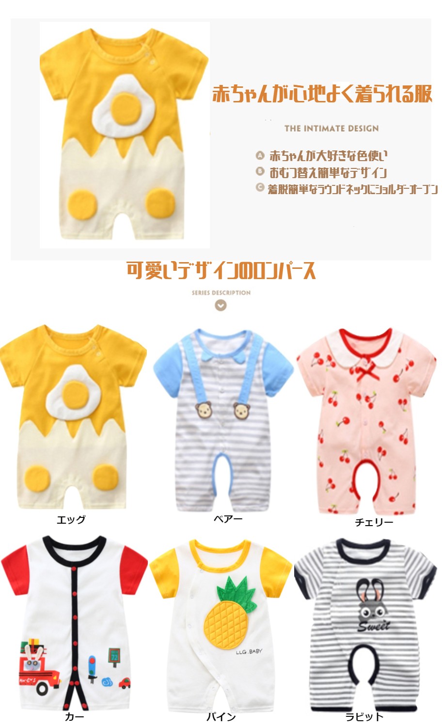 肌ざわりGOODロンパース 赤ちゃん 着脱簡単 かわいいデザイン 半袖 BABY 夏 普段着 お出かけ ■ 商品説明肌触りが気持ちよくとても可愛いデザインのロンパースです。お家にいるときもお出かけする時も着ていけておむつ交換とても簡単なスナップボタンです。デザインがとても個性的でお出かけ時にも注目間違いなし!綿100%で、暑い夏でも赤ちゃん気持ちいいです♪0か月から3歳(36ヶ月)までのサイズがあって赤ちゃんにピッタリの1品■ カラーエッグ(イエローホワイト) / ベアー(ブルーホワイト) / チェリー(ピンクレッド) /カー(ホワイトレッド) / パイン(イエローホワイト)/ ラビット(ダークブルーホワイト)■ サイズ0-3ヶ月(59cm) / 3-6ヶ月(66cm) / 6-12ヶ月(73cm) / 12-18ヶ月(80cm) / 18-36ヶ月 (90cm) ■ 素材綿100%■ 検索ワードカバーオール 赤ちゃん 男の子 女の子 ユニセックス ベビー 半袖 お出かけ キャラクター 赤ちゃん着 下着 ボディースーツ 夏 着心地よい コットン ベビー用 キッズ 可愛い pretty かわいい 肌着 パジャマ ベビー服 新生児 子供服 半袖 出産祝い プレゼント