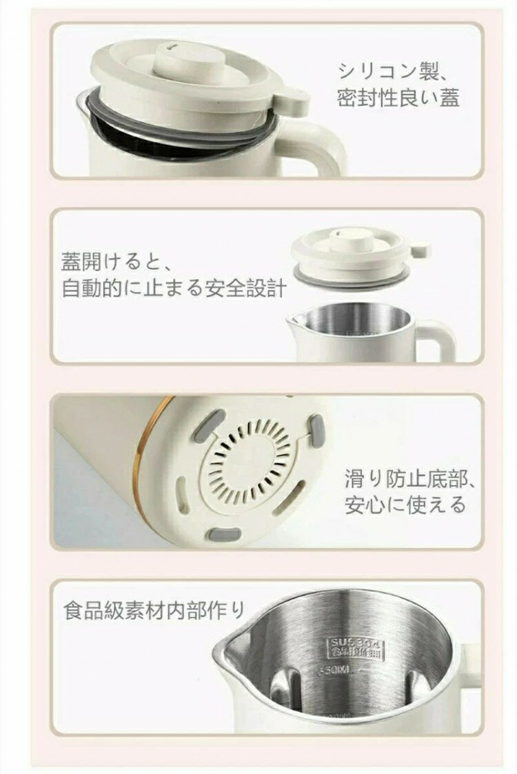商品情報:御注意:※説明書はPDF版となります。商品出荷後に必要のお客様はご連絡ください。※沖縄、北海道への発送致しませんので、誤ってご注文頂く場合は、ご注文をキャンセルさせて頂きます。商品名:YALULU自動調理ポットサイズ:約 250mmx130mmx160mm重量:約 1.1kg材質:ポリプロピレン、ステンレス 等仕様:電源電圧:AC100V 50/60Hz定格消費電力:加熱機能500W、攪拌機能120W定格容量:800ml回転数(無負荷時):約 13500回転/分生産国:中国製豆乳、ペースト、お粥、お湯、ジュース、洗浄。ボタンを押すだけで加熱調理から粉砕まで全自動で行う加熱式ブレンダーです。いわば、電気ケトルとフードプロセッサーを合わせた一台!食材を丸ごと、沸騰させずに調理するので、大豆そのままの栄養を含んだ豆乳をご自宅で楽しめます。ポタージュや離乳食はもちろん、非加熱モードでフレッシュジュースも!【800ml大容量】女性でも楽々持ち運べる軽さと、コンパクトなサイズ感と、そのまま注ぎやすい形状。一度におよそコップ2〜3杯分の量(350-650ml)を作る事ができます。一台だけで、自宅、オフィスなど様々な場所に適用出来ます【高品質なモーター】フードレベルステンレス製丈夫な刃ブレード10枚を採用し、優れい500W(加熱)と120W(ミックス)のパワーモーターを搭載します。【お手入れ簡単】この加熱式ブレンダーの場合、刃を取らずそのまま自動洗浄してくれます洗浄モードを押して放置し、水で濯ぎ洗いをするだけでお手入れ完了。 忙しい朝にも楽々管理できるので健康習慣をしっか。り続けられます。最短20分で、豆乳が作られます。自動調理ポット 完全豆乳メーカー 豆乳 ホワイト ライトグリーン
