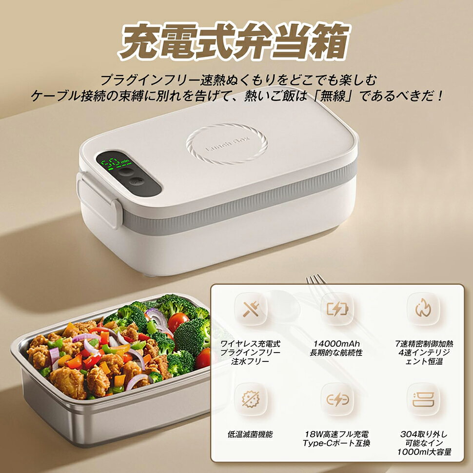 電熱弁当箱 1L大容量 ランチボックス 14000mAh USBワイヤレス充電式 高速加熱 注水不要 304ステンレス 可脱着式内釜 携帯便利 保温弁当箱 ホワイト 持ち運び