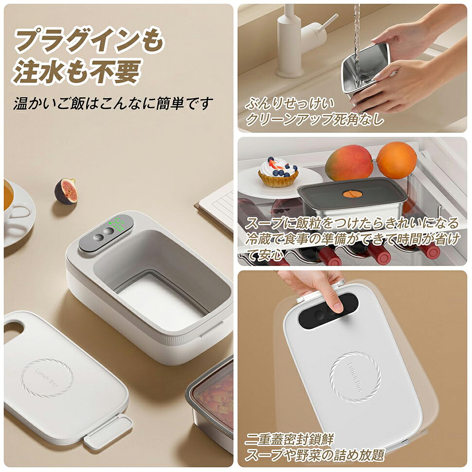 タッチデジタルディスプレイ:加熱時間と保温温度を簡単に表示。加熱時間は7段階(20分/30分/40分/50分/60分/70分/80分)、保温温度は4段階(40℃/45℃/55℃/ロータリー低温滅菌30分)で調整可能。 1L大容量:2〜3人分のご飯や複数の料理を一度に入れられます。忙しいサラリーマンのランチや学生の栄養食もこれ一台で完結。食事の準備と摂取をスムーズにし、毎回しっかりエネルギー補給できます。 ワイヤレス充電:14000mAhバッテリー内蔵。約4時間でフル充電、90分使用可能で食事2回分の加熱が可能。保温は約5時間。ワイヤレス設計で外出先でも便利に使用できます。 取り外し可能な内胆:304ステンレス製内胆は取り外し可能で、特殊加工により耐食性・耐落下性・清潔性・耐老化性を備え、長持ちします。分解設計で徹底的に洗浄可能。頑固な油汚れも簡単に落とせ、隅々まで清潔に保てます。 注水フリー二重蓋密封:二重蓋で食品の鮮度をしっかりキープ。汁漏れの心配がなく、スープや野菜も安心して持ち運べます。準備から食事まで、いつでも美味しさを楽しめます。