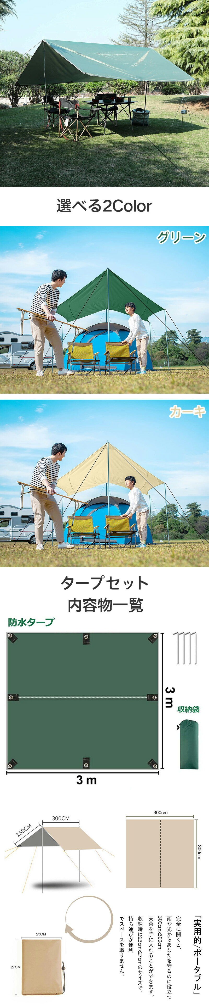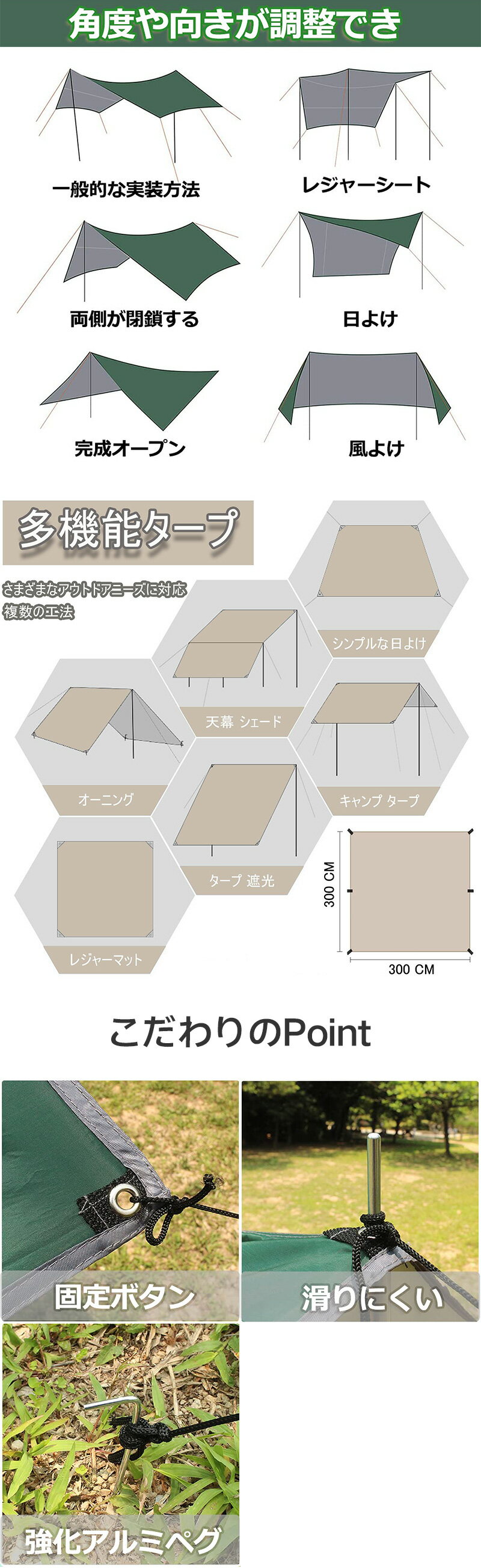 ※モニター発色の具合により色合いが異なって見える場合がございます。 商品詳細 【詳細】 【一台多役のタープ】この多機能のタープは使用人数・場所に応じて、多様な使い方が可能あります。お花見、花火鑑賞、ピクニック、遠足、公園、運動会など活動で、レジャーシートとして使えます。四隅をロープで引っ張ると天幕になり、防水タープやサンシェルターとしても利用できて、釣り、キャンプ、登山、バーベキューなど様々なアウトドアシーンに最適です。 【遮光遮熱】この天幕シェードの裏側には紫外線をカットするシルバーコーティングをが施され、日差しが強い時にしても充分な日陰を確保できます。抜群の遮光性で涼しく過ごせます。 【収納バック・携帯便利】防水タープは収納袋が付属していますので、持ち運び易いです。トレッキングや自転車、オートバイのソロツーリングなどにも気軽に持って行けるタープの最軽量モデルです。シンプルな構造で使いやすいし、アウトドア初心者でも安心の簡単組み立て! 【雨よけ・防水仕様】生地の表面に撥水加工処理済みで、耐水圧3000mm以上、防水性能抜群です。防水機能がありますので、急な雨や大雨にも全然安心!