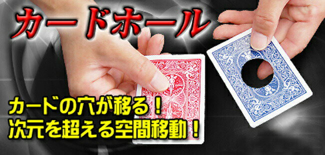 カードの穴がカードに移る、ユニークな空間移動! カードに開いた穴が別のカードに移動します。 【効果】 中央に大きな穴が開いた赤裏のカードと、青裏のカードを見せます。 青裏のカードに赤裏のカードを重ねると、赤い穴のカードから青裏のカードの裏面が見えています。 この2枚のカードをこすり合わせると、何と赤いカードの穴は完全に消えてしまい、1枚のカードになってしまい、青いカードの方に同じ大きさの大きな穴が開いています! 【特徴】 目の前で見せられ、とてもビジュアルで、しかも、難しい技術を使わず気軽に見せられるポケットトリックです。 穴の開いたカードは演技の前後に調べてもらうこともできます。 ※演技に必要な用具が一式セットされています 難易度:初級〜中級