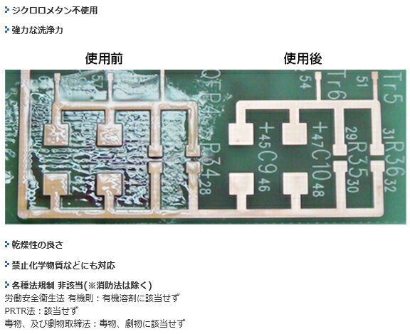 【メーカー】 ●白光(株) 【注意】 ※こちらの商品は受注生産品です。(キャンセル・返品不可) 納期にお時間を頂く場合がございます。予めご了承下さい。 【特長】 ●除去率UPしたフラックスリムーバー ●強力な洗浄力 ●ノンフロン・ノンエタン ●自動機パーツ、プリント基板、電子部品などに付着した論じフラックスや油汚れの除去に最適。 ●ジクロロメタン不使用 ●乾燥性の良さ ●禁止化学物質等にも対応 ●各種法規制 非該当(※消防法は除く) ・労働安全衛生法 有機則:有機溶剤に該当せず ・PRTR方:該当せず ・毒物、及び劇物取締法:毒物、劇物に該当せず 【仕様】 ●品番:FS150-81 ●成分: ・シクロペンタン(20〜30%) ・エタノール(10〜20%) ・イソプロピルアルコール(1%未満) ・プロピルアルコール(5%未満) ●内容量:300g(420mL) ●保管に関する法令:危険物第4類第1石油類(非水溶性)