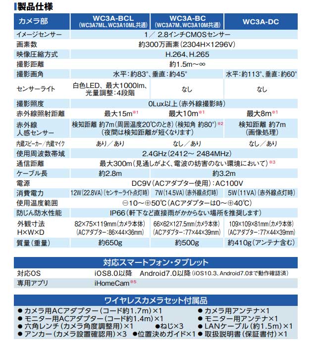 ▼この商品の関連商品はこちら≪WC3A-RP≫≪WC3A-BCL≫≪WC3A-BC≫WC3A-DC 商品説明仕様・特徴 簡単セットですぐ映るモニターとワイヤレスカメラのセット用の増設カメラ。簡単な設定で合計4台まで接続できます。天井に設置しやすいドーム型です。増設カメラドーム型カメラ防じん防水IP66※型式が「WHC」で始まるWHCシリーズのモニター&ワイヤレスHDカメラセットと接続はできません。※外付けハードディスク、microSDカードは付属していません。イメージセンサー:1/2.8インチCMOSセンサー画素数:約300万画素(2304H×1296V)撮影距離:約1.5m〜∞電源:DC9V(ACアダプター):AC100V消費電力:5W(11VA)(赤外線点灯時)サイズ 外観寸法H×W×D:109×109×81mm(カメラ本体)重量 約410g付属品ACアダプター(コード約1.7m)×1個アンテナ×1本アンカー、ねじ(防水パッキン付き)×各3本位置決めガイド×1部六角レンチ(カメラ角度調整用)×1個