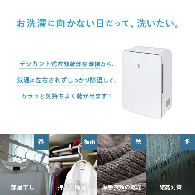 DJ-LTS8N-W 商品説明シリーズ 衣類乾燥除湿機カラー ホワイト仕様・特徴 お洗濯も除湿ももっと気持ちよく除湿方式:デシカント式除湿能力:8.0L/日タンク容量:約4.0Lで自動停止電源電圧:AC100V 50/60Hz消費電力:720/720W 50/60Hz【除湿面積】木造(戸建):10畳まで(約17m2)プレハブ:15畳まで(約25m2)コンクリート:(集合)20畳まで(約33m2)スピード衣類乾燥・夜ドライモード「壁にピッタリ」送風で効率よく除湿大きく持ち運びやすいらくらくハンドル銀イオンフィルターで抗菌電源コード2.5mサイズ 外形寸法(高さ×幅×奥行):506×350×240mm重量 約7.2kg