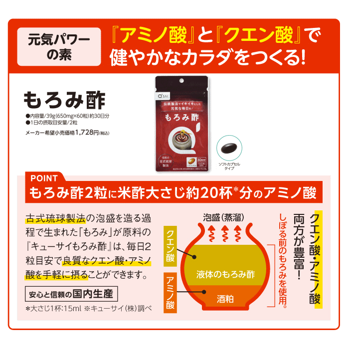 古式琉球製法で作った元気の源「キューサイもろみ酢」です。 ▼商品特長 泡盛を作る過程でできる良質なアミノ酸とクエン酸を含むもろみを、まるごとフリーズドライにして配合しました。1日の目安2粒で補えるアミノ酸は、一般米酢の大さじ約20杯分。アミノ酸とクエン酸がしっかり摂れます。 メーカー希望小売価格はメーカーカタログに基づいて掲載しています商品情報 内容量 1袋あたり650mg×60粒入り(約30日分) 1日目安量 2粒 お召し上がり方 1日2粒を目安に、噛まずに水またはぬるま湯でお召し上がりください。 賞味期限 商品パッケージをご確認ください。 保存方法 直射日光・高温多湿を避けて保存してください。 原材料名 もろみ酢粉末(国内製造)、サフラワー油(国内製造)、オリーブ油/ゼラチン、グリセリン、ミツロウ 栄養成分:2粒1300mgあたり エネルギー/7.4kcal、たんぱく質/0.48g、脂質/0.50g、炭水化物/0.27g、食塩相当量/0.006g、クエン酸/24.9mg 商品区分 健康食品 メーカー名 キューサイ株式会社 生産国 日本 広告文責 株式会社ティー・エス・ピー(0120-37-0831) その他 ・ギフト対応も可能でございます。 市販のお酢商品は、液体か沈殿物のどちらか一方だけを製品化したものが多く、クエン酸を人工的に添加していることも。キューサイ もろみ酢は、泡盛をつくる過程でできる良質なアミノ酸とクエン酸を含むもろみをまるごとフリーズドライして配合しました。 黒麹菌と昔から伝わる古式琉球製法により育まれた元気の源が、ソフトカプセルにぎっしり詰まっています。また、他のキューサイ商品と同様、厳格な検査に合格した商品だけを製品化しておりますので、毎日安心して続けていただけます。 私たちの体の約20〜25%は、たんぱく質でできています。このたんぱく質を構成している成分がアミノ酸です。アミノ酸の中でも、必須アミノ酸は体内で合成できません。従って、食べ物から積極的に補うことが大切なのです。 クエン酸は、酢や柑橘類に含まれる酸味の成分。梅干しなどにも多量に含まれており、古来から日本人の食卓にもおなじみの成分です。 1日の目安2粒で補えるアミノ酸は、一般米酢の大さじ(※1)約20杯分(※2)。 アミノ酸とクエン酸がしっかり摂れます。 ※1 大さじ1杯:15ml ※2 自社調べ ●ご注意 ・お薬を服用されている方、または通院中の方は、医師とご相談の上、お召し上がりください。 ・他の食品と同様、体質や体調により、まれに発疹、嘔吐、下痢、便秘、アレルギーなどの症状が出ることがあります。お体に合わない場合は飲用を中止し、医師にご相談ください。 ・乳幼児の手の届かないところに保管してください。 ・保存状態により、カプセルが変形または、カプセル同士が接着する場合がありますが、品質には問題ありません。安心してお召し上がりください。 ・カプセルを潰すと内容物が飛び出して、衣服を汚す可能性がありますのでおやめください。 ・パッケージは予告なく変更になる場合がございます。 食生活は、主食、主菜、副菜を基本に、食事のバランスを。