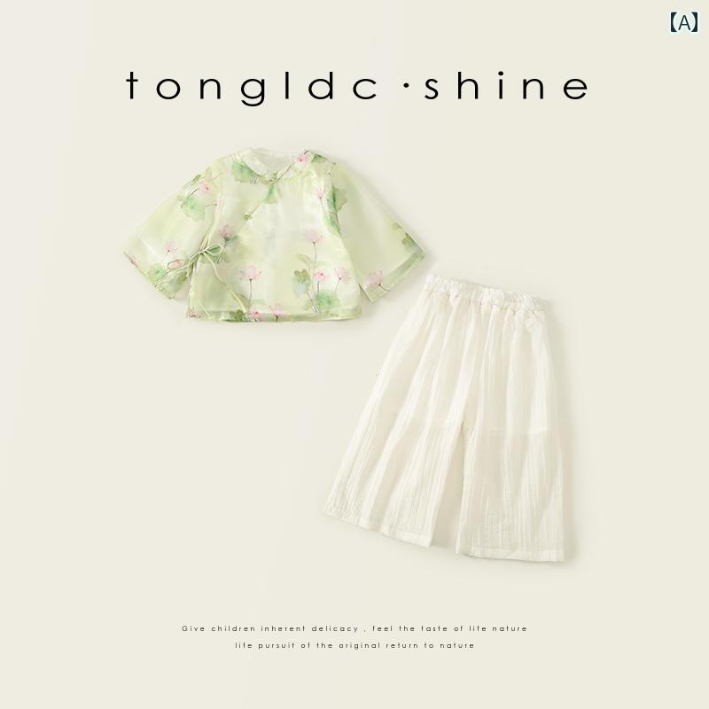 ベビー キッズ かわいい 女の子 セット 夏 チャイナ風 女の子 子供 漢服 夏服 2点セット セットアップ ワイドレッグパンツ ふわふわシフォン ゆったり