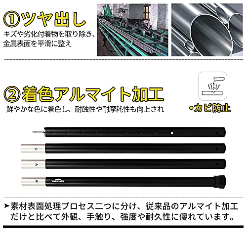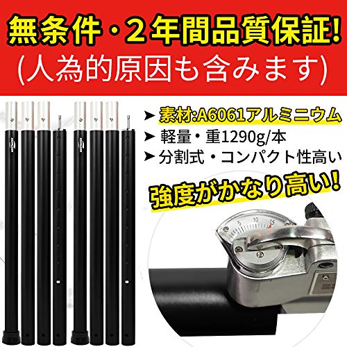 アウトドア用・ブラック本入り 本入り ・・olor:ブラック本入り・材質:A6061アルミ合金を採用となり、従来品のA6063より強度がかなり高い、耐食性も比較的に良好で、末永く愛用していくことができます。・サイズ: 長さ約68c、直径33、厚さ15、継手80との頑丈な作りをしていて、折れにくくて、タフで耐久性にも優れ、強風の際、強めのテンションの張りにも耐えられます。収納時ほぼ長さ70cとのコンパクトサイズに抑えられます。・分割式ポール+プッシュアップトップ節:4節連結タイプで長さ調整範囲が10c〜80cの間で4段階まで長さがアレンジできます。 連結本数によって60cごとに長さ調節可能、10c・180c・40c三段階とプッシュアップトップ節によって5c/10cごとに長さ調節可能、10c+5c+5c+5c+5c+5c+5c七段階で自由に伸縮可能、数多い段階で長さを選べます。ポールの高さと低さを簡単に調整して高低差を作って防雨・防風対策にアレンジできます。・ポッシュボタン式:プッシュボタン式で、差し込