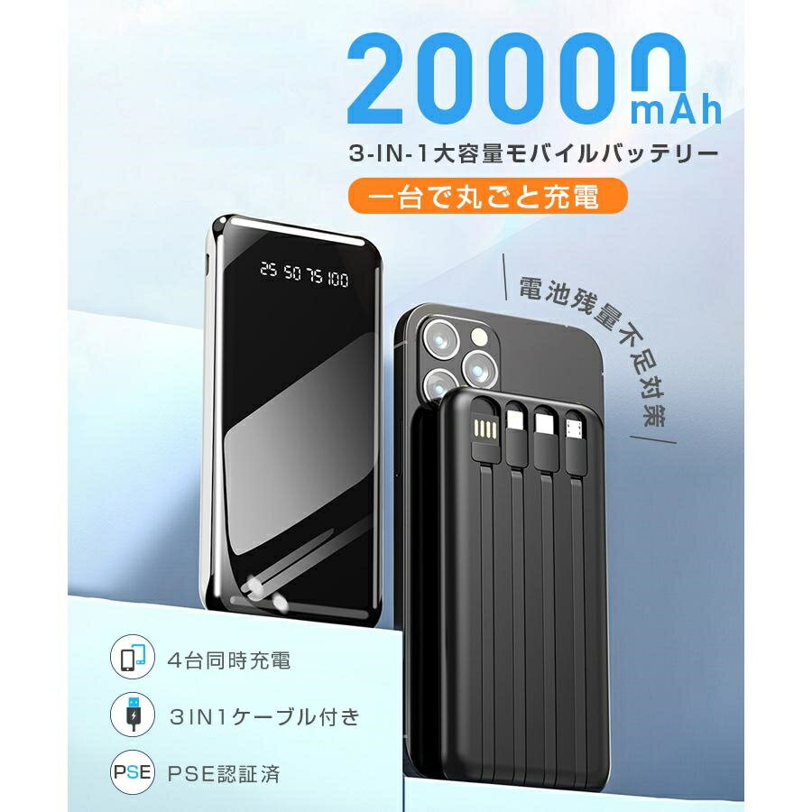 モバイルバッテリー 20000mAh 大容量 軽量 iPhone/Android対応 スマホ充電器 高速充電 機内持ち込み 4台同時 小型 ランプ 残量表示 PSE認証済み