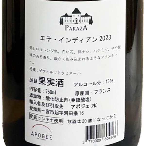 シャトー・パラザ エテ インディアン オレンジ フランス ラングドック 2023 750ml ゲヴュルツトラミネール100% L’été Indien
