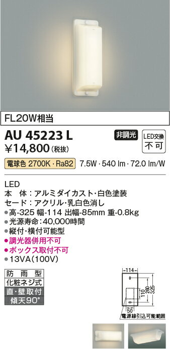 サイズ:高さ325 幅114 出幅85mm 重さ:0.8kg 消費電力:7.5W 色温度:2700K 演色性:Ra82 光源寿命:40,000時間 傾斜天井に取付可能(90°まで) 絶縁台不要 縦付・横付可能型 調光器との併用はできません ※色温度:2700K ※FL20W相当 材質・色:アルミダイカスト-白色塗装、アクリル-乳白色消し LEDユニット:LED一体型 明るさ:FL20W相当 電気工事:取付には、専門家による電気工事が必要です。※取付は「電気工事士」の有資格者にご依頼ください。 ※商品のリニューアルにより、品番や仕様が変わる場合がございます。ご注文のタイミングにより仕様等、表記と相違がある場合がございますが、その際は同等品かそれ以上の性能の商品をお届けさせていただきます。予めご了承下さいますようお願い致します。 メーカー希望小売価格はメーカーカタログに基づいて掲載しています メーカー取寄品です。現在半導体不足の影響によりメーカー在庫が安定しておらず、長期欠品の場合もございます。長期欠品の際は大変申し訳ございませんが、弊社都合でのキャンセルとさせて頂く場合がございますので予めご了承ください。また、メーカー価格改定により商品子組画像と定価表示が異なる場合がございます。