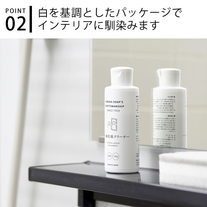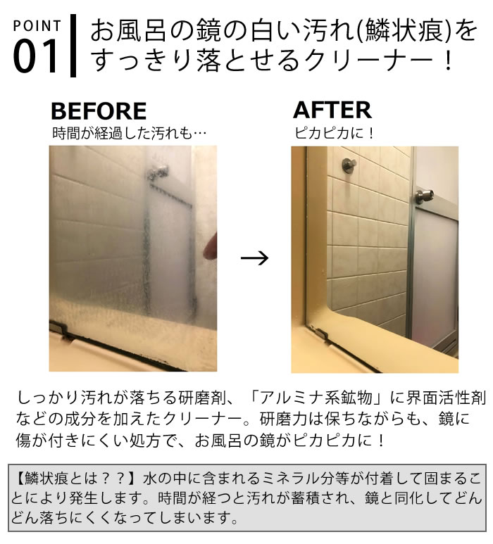 商品名 Cシリーズ 鏡の鱗状痕クリーナー 150g 商品詳細 サイズ 約 W4.5×D4.5×H13cm 重量 約174g(正味量:150g) 素材 ■品名:クレンザー ■成分:研磨材(41%アルミナ系鉱物)、界面活性剤(1%ポリオキシエチレントリデシルエーテル)、増粘剤(カルボキシメチルセルロース)、 安定化剤(エタノール、エチレングリコールモノターシャリーブチルエーテル)、pH調整剤(クエン酸)、防腐剤(フェノキシエタノール)、 湿潤剤(ポリアルキレンオキシド変性ヘプタメチルトリシロキサン)、乳化剤(ヤシ油)、精製水 ■液性:中性 原産国 日本製 備考 【使用用途】:浴室の鏡の鱗状痕落とし 【使用量の目安】:スポンジに適量塗布 【ご使用方法】 1.対象部分に付着した汚れを水洗いしてください。(キズの原因になります)軽く水分を拭き取り、容器をよく振ってからスポンジに適量塗布し、円を描くように磨き落としてください。 2.その後、十分に水洗いをし、乾いた布で拭きとって下さい。(油膜の原因になるので、洗剤や油分を含んでいない布を使用してください)汚れが落ちない場合は同じ作業を繰り返してください 。 【使用できないもの】 ※フィルム加工や塗装を施したガラス面。 ※メガネなどのレンズや樹脂製品、撥水性ガラス、軟質タイプのガラス。 ※車輌の撥水性フロントガラスやミラー。 ※ご使用前によく振って下さい。 ※用途以外に使用しないで下さい。 ※高温や凍結を避け、幼児の手の届かない場所に保管して下さい。 ※システムバスの場合には、構造上強く押しすぎると鏡が破損する場合があります。 検索キーワード 鏡 曇り止め 鏡のウロコ Cシリーズ 鏡の鱗状痕クリーナー 150g うろこ状 日本製 水垢落とし ガラス 研磨剤 浴室 風呂場 クレンザー バス用品 C SERIES 水垢取り ミラー ラッピング ラッピングOK →詳細はこちらCシリーズ 鏡の鱗状痕クリーナー 150g なかなか落ちない白い汚れすっきり落としてキレイな鏡に お風呂の鏡の白いウロコ状の汚れ。 なかなか落ちなくて困っていませんか? この汚れは「鱗状痕(りんじょうこん)」と呼ばれており、普段使ってるバスクリーナーでは落ちない厄介な汚れ。 「Cシリーズ 鏡の鱗状痕クリーナー」は鱗状痕を落としながら、鏡に傷が付きにくい処方で、安心してお使いいただけます。 白を基調としたおしゃれなパッケージは、あえて見えるところに置きたくなる可愛さです♪ 関連商品 Cシリーズ 鏡の鱗状痕クリーナー 150g Cシリーズ 鏡のくもり止め Cシリーズ お風呂まるごと洗浄剤 →シリーズ一覧を見る