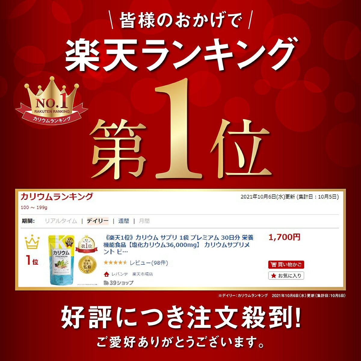 うれしい「送料無料」 ※「ネコポス・メール便(ポスト投函)」対応可 ・お届け日時はご指定いただけません。 ・対応サイズを超える場合は自動的に宅配便配送へ振替となります。 ※宅配業者はご選択いただけません。 ※転売目的でのご注文はご遠慮いただいております。 なお、当店が転売目的と判断した場合は、ご注文をキャンセルさせていただく 場合がございます。ご了承ください。 商品名 カリウム プレミアム 原材料 還元麦芽糖水飴(国内製造)、デキストリン、赤ブドウ葉抽出物、ビタミンE含有植物油、植物抽出エキス【植物抽出エキス(ハトムギ、アズキ、ハス果実、オオバコ種子、オタネニンジン、カンゾウ)、デキストリン】、コーンシルク末、生姜末 / 塩化カリウム、セルロース、微粒酸化ケイ素、ステアリン酸Ca、加工デンプン、ビタミンB1、ビタミンB2、ビタミンB6、ビタミンB12 内容量 108g(400mg×270粒)×2袋 栄養成分表示 (9粒3.6gあたり) エネルギー:9.58kcal、たんぱく質:0.007g、脂質:0.06g、炭水化物:2.26g、食塩相当量:0.003g、ビタミンB1:1.2mg(100%)、ビタミンB2:1.4mg(100%)、ビタミンB6:1.3mg(100%)、ビタミンB12:2.4μg(100%)、ビタミンE:2.0mg(31.7%)、カリウム:630mg ※塩化カリウム:1200mg ※()内の値は栄養素等表示基準値(18 歳以上、基準熱量2,200kcal)に対する割合です。 栄養機能食品 (ビタミンB1、ビタミンB2、ビタミンB6、ビタミンB12、ビタミンE) ビタミンB1は、炭水化物からのエネルギー産生と皮膚と粘膜の健康維持を助ける栄養素です。ビタミンB2は、皮膚や粘膜の健康維持を助ける栄養素です。ビタミンB6は、たんぱく質からのエネルギー産生と皮膚や粘膜の健康維持を助ける栄養素です。ビタミンB12は、赤血球の形成を助ける栄養素です。ビタミンEは、抗酸化作用により、体内の脂質を酸化から守り、細胞の健康維持を助ける栄養素です。 お召し上がり方 1日9粒を目安に水やぬるま湯などと一緒にお召し上がりください。 ご使用上の注意 〇お子様の手の届かない場所に保管してください。 〇原材料をご確認の上、食物アレルギーの有る方はお召し上がりにならないでください。 〇製品の性質上、色調が異なる場合がございますが、品質には問題はございません。 〇妊娠、授乳中の方または通院中の方はかかりつけの医師にご相談の上、ご利用ください。 〇体質に合わない場合は摂取を中止してください。 保存方法 直射日光、高温多湿を避けて、なるべく涼しい場所に保存してください。 販売元 レバンテ株式会社 区分 日本製/健康食品 広告文責 レバンテ株式会社 0120-737-111 ※効果の実感には個人差がございます事を予めご了承ください。\ 新規お友だち登録で今すぐ使える /★この商品をお気に入り登録する