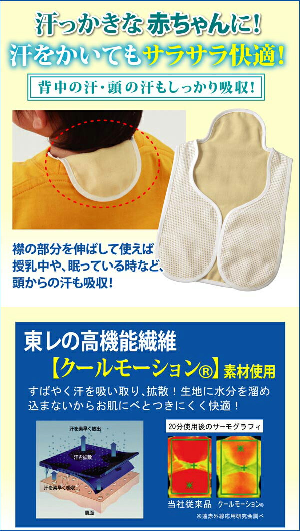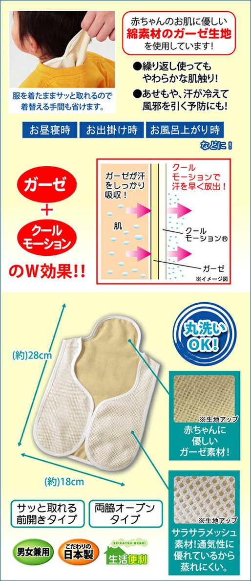 クールでドライな清涼汗取りパッド ベビー 汗っかきな赤ちゃんに!汗をかいてもサラサラ快適! ◆ガーゼ仕様でお肌に優しい!赤ちゃん用の汗取りパッドが登場! ◆表地は赤ちゃんの肌に優しいガーゼ素材。汗をしっかり吸収し、繰り返し使ってもやわらかな肌触り! ◆裏地は東レの“クールモーション”を使用。べとつきにくく、サラッとしたクールな感触で快適! ◆前開き・両脇オープンタイプなので、服を着たままサッと脱げて着替える手間も省けます。 ◆お昼寝時、お出掛け時、お風呂上がり時などに!あせもや汗が冷えて風邪を引く予防にも! サイズ (約)18×28cm 重量 (約)19.2g 材質 表地:綿(2重ガーゼ) 裏地:ポリエステル(東レ クールモーション(R)素材使用) テープ:ポリエステル・綿 生産国 日本 広告文責 株式会社ルーマニア/03-5876-8107