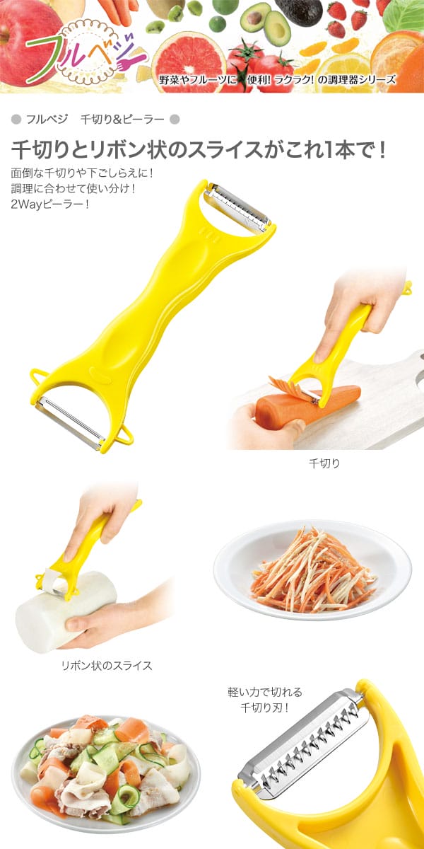 下村工業フルベジ 千切り&ピーラー FV-634 千切りとリボン状のスライスがこれ1本で! 面倒な千切りや下ごしらえに!調理に合わせて使い分け!2Wayピーラー! サイズ (約)53 ×12 ×193mm 重量 (約)40g 材質 ピーラー刃/ ステンレス刃物鋼千切り刃/ ステンレス鋼 ハンドル/ ABS樹脂 広告文責 株式会社ルーマニア/03-5876-8107 【メーカー:下村工業】