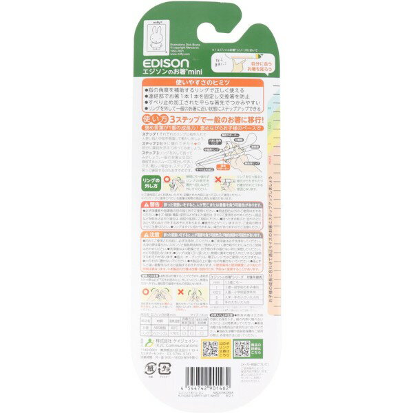 KJC エジソンのお箸 ミニ ミッフィー リングに指を入れるだけ!正しく持てる設計! 手の小さいお子様のお箸デビューに! 小さくて軽いエジソンのお箸。 お子様の手の大きさに合わせて大きさと角度を極めた3つのリングがはじめてのお箸使いをサポートします。 ●指の角度を補助するリングで正しく使える。 ●連結部でお箸1本1本を固定し交差箸を防止。 ●すべり止め加工された平らな箸先でつかみやすい。 ●リングを外して一般のお箸に近い状態にステップアップできる。 【対象年齢】 1.5歳ごろ~ 【使い方】 3ステップで一般のお箸に移行! ★ステップ1 それぞれのリングに指を入れて人差し指と中指を意識して動かしましょう。 ★ステップ2 動きに慣れてきたら、薬指サポーターの部分に薬指を添えてもってみましょう。 ★ステップ3 リングを外して持ってみましょう。一般のお箸と交互に練習するとスムーズに移行しやすいです。 ※難しいようでしたらステップ2へ戻って繰り返し練習します。 ※リングを外す際は無理に引っ張らず、リングの根本を箸先へ回しながら外してください。 【耐熱温度】 本体・・・80度 リング・・・170度 【注意】 ・必ず指導者の目の届く所でご使用ください。 ・用途目的以外のご使用はおやめください。 ・キズ、破損、亀裂、変形などが生じた場合は、すぐにご使用をおやめください。 ・持ったまま転ぶと、目やのどに当たり思わぬケガをする場合があります。 ・箸先がとがっていますので、使用時は十分にご注意ください。 ・リングは指からすぐに外れない場合がありますのでご注意ください。 ・初めてご使用される前に、必ず洗浄をしてください。 ・ご使用後は必ず洗浄をしてください。洗浄の際は柔らかいスポンジと食器用洗剤をご使用ください。磨き粉やたわしなどのご使用はおやめください。 ・洗浄後はよく水を切って乾燥させて保管してください。 ・リングは、強く引っ張ったり、無理に奥まで指を入れたりすると切れる場合があります。 ・直火、オーブングリル、電子レンジではご使用いただけません。 ・火の側に置かないでください。 ・本製品の上に重いものを載せないでください。 ・落とすなど強い衝撃を与えると破損する恐れがあります。 商品名 KJC エジソンのお箸 mini ミッフィー タイプ 右手用・左手用 内容量 1膳 サイズ 14cm 材質 本体・・・ABS樹脂 リング・・・シリコーンゴム 生産国 韓国 広告文責 株式会社ルーマニア/03-5876-8107